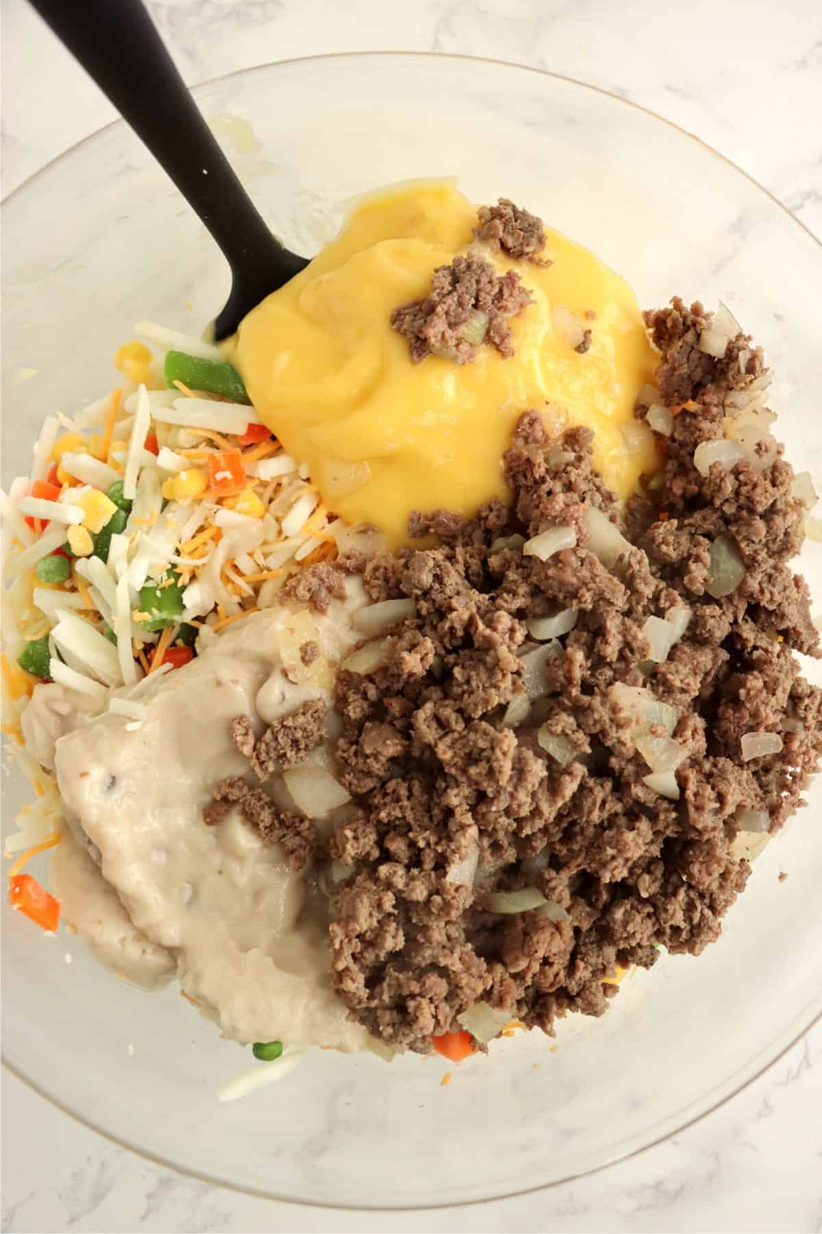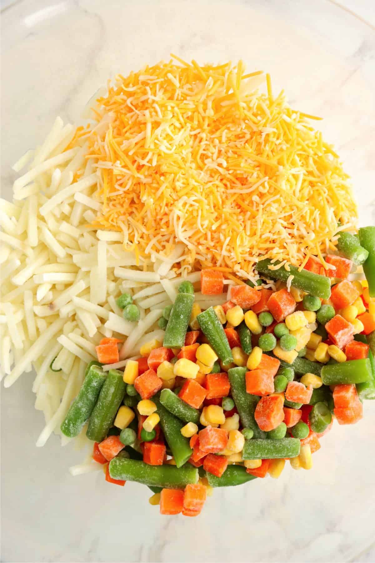 2: Combine the hash browns, vegetables, and shredded cheese in a large bowl.