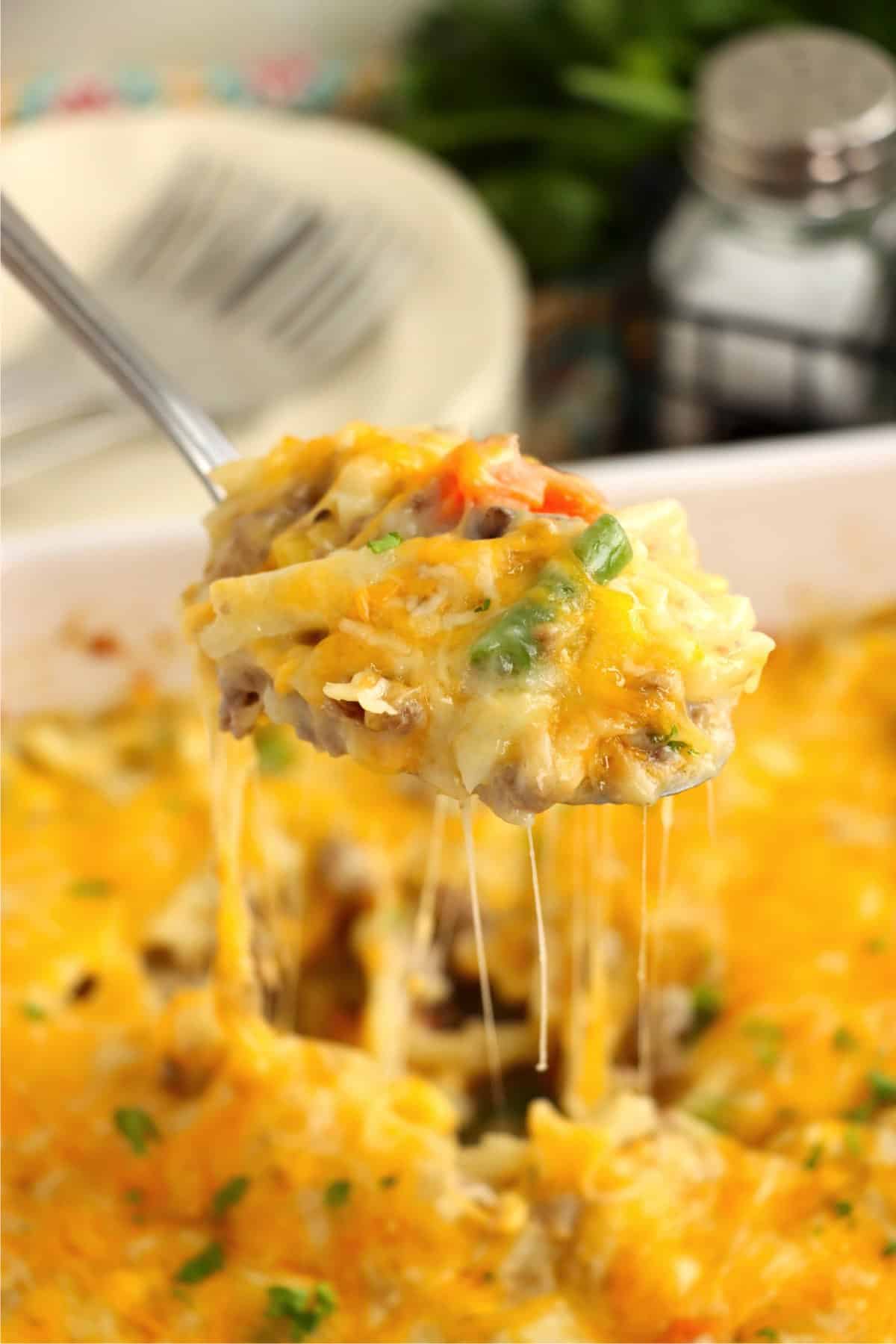 Ground beef and hash brown casserole is hearty, filling, and loaded with ground beef, veggies, cheese, and potatoes. The perfect meal!
