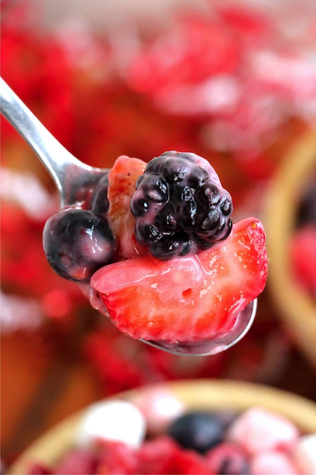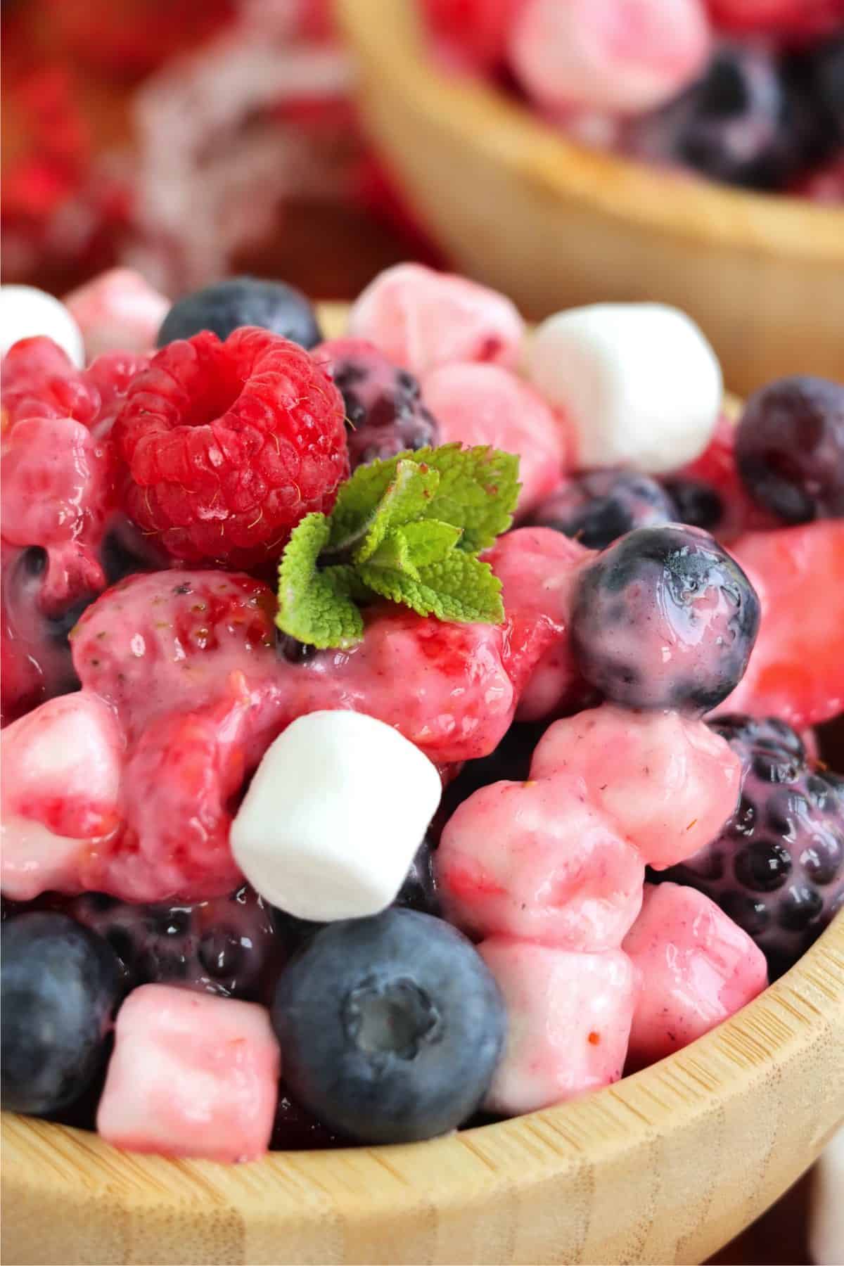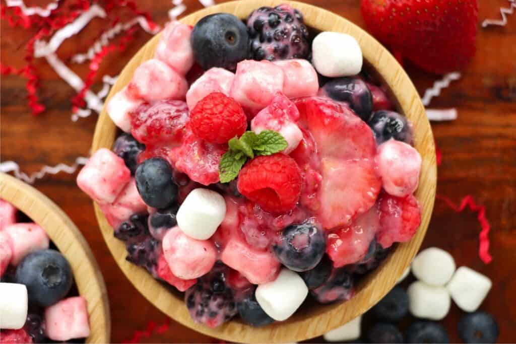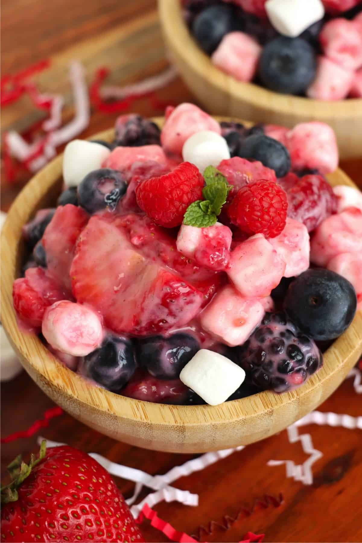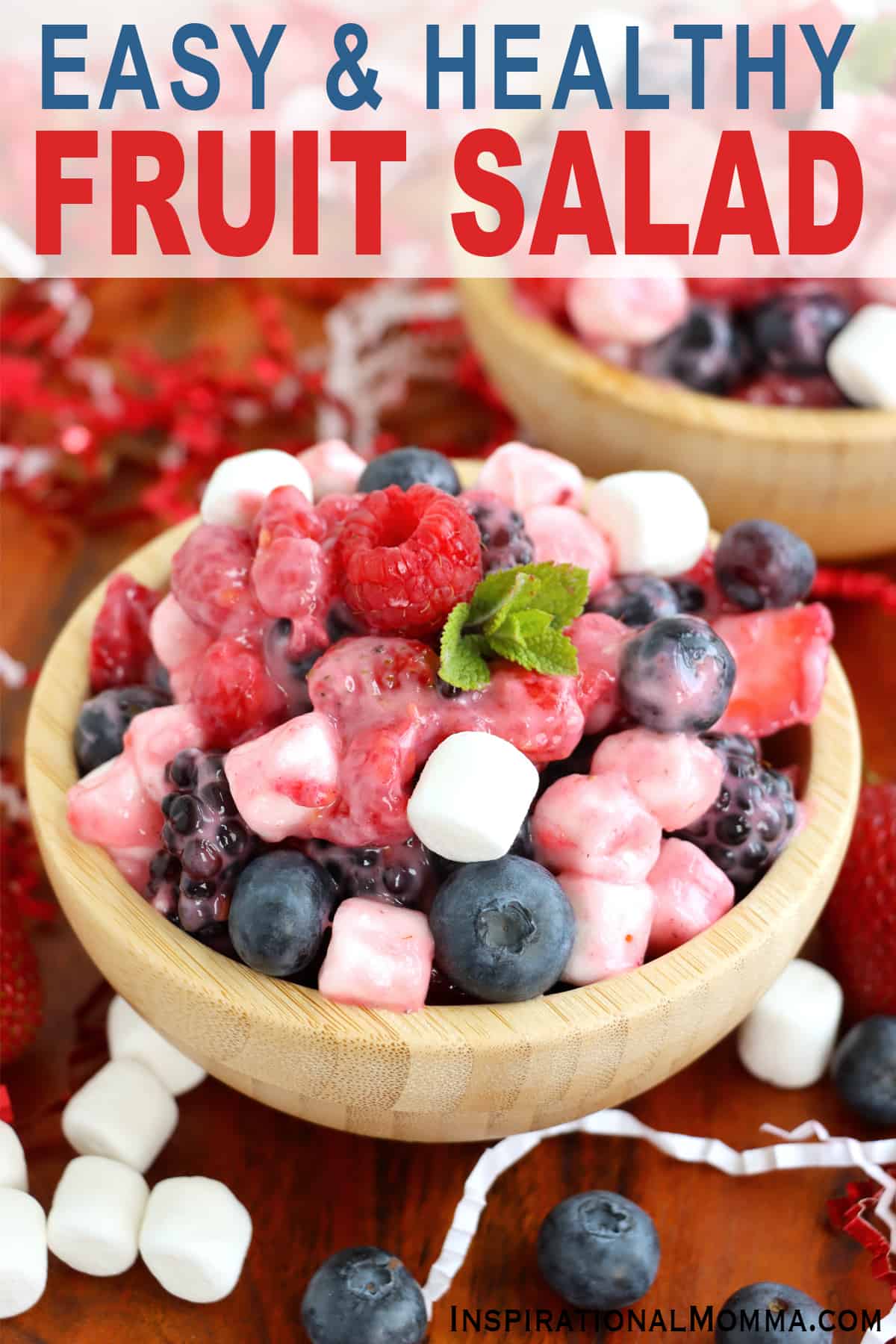 This healthy fruit salad recipe is full of delicious berries, mini marshmallows, and yogurt for its creamy base. It's a summertime hit!
