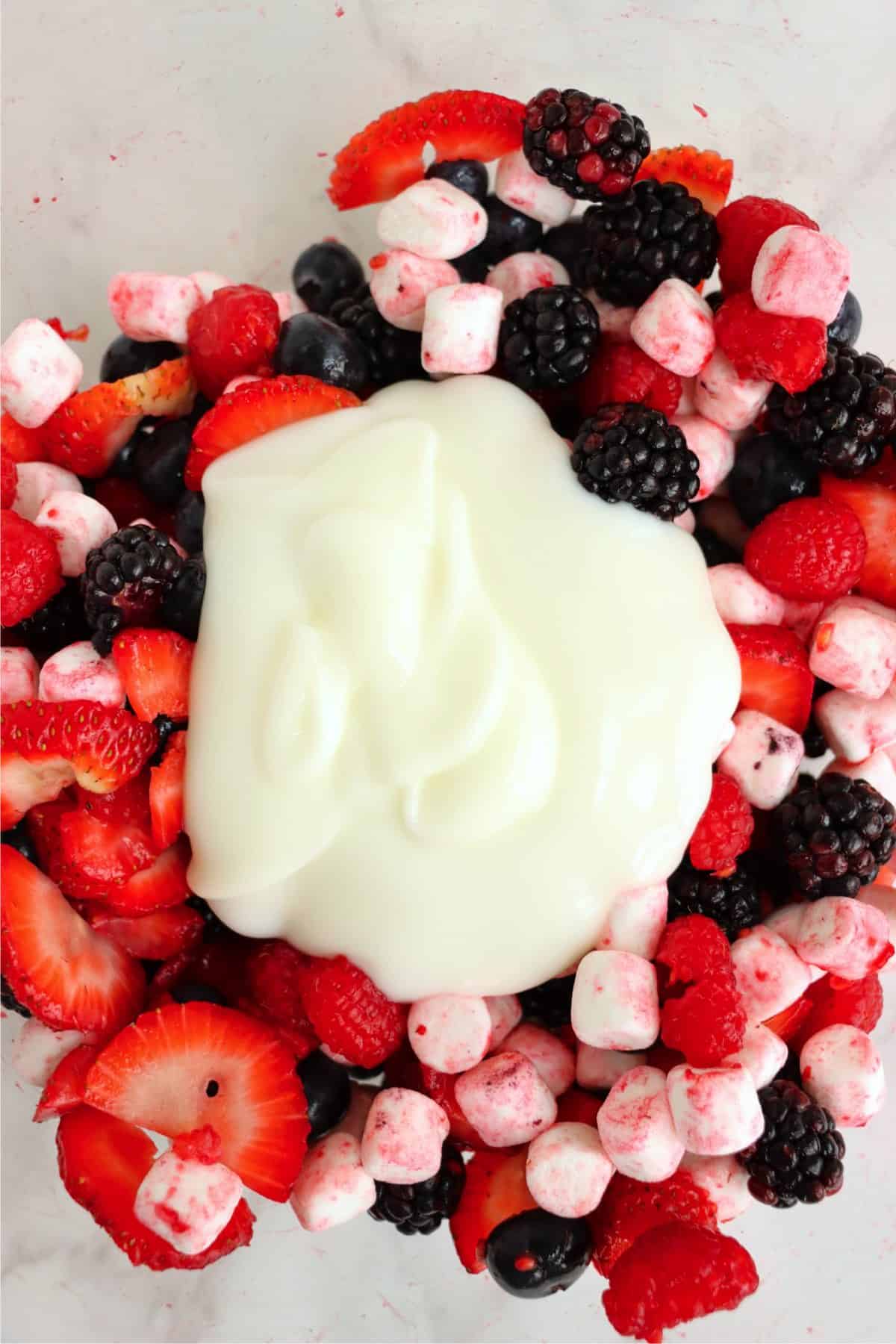 All you need for this recipe is fresh berries, mini marshmallows, and yogurt. That's it! Be sure to check the recipe card at the end of the post for exact quantities.