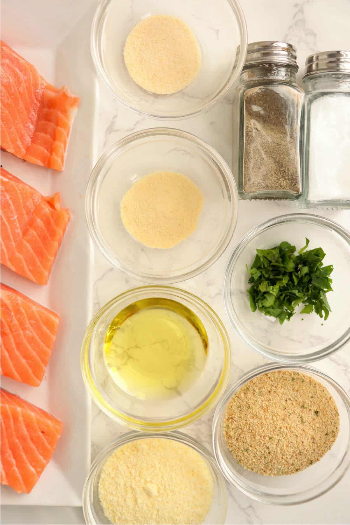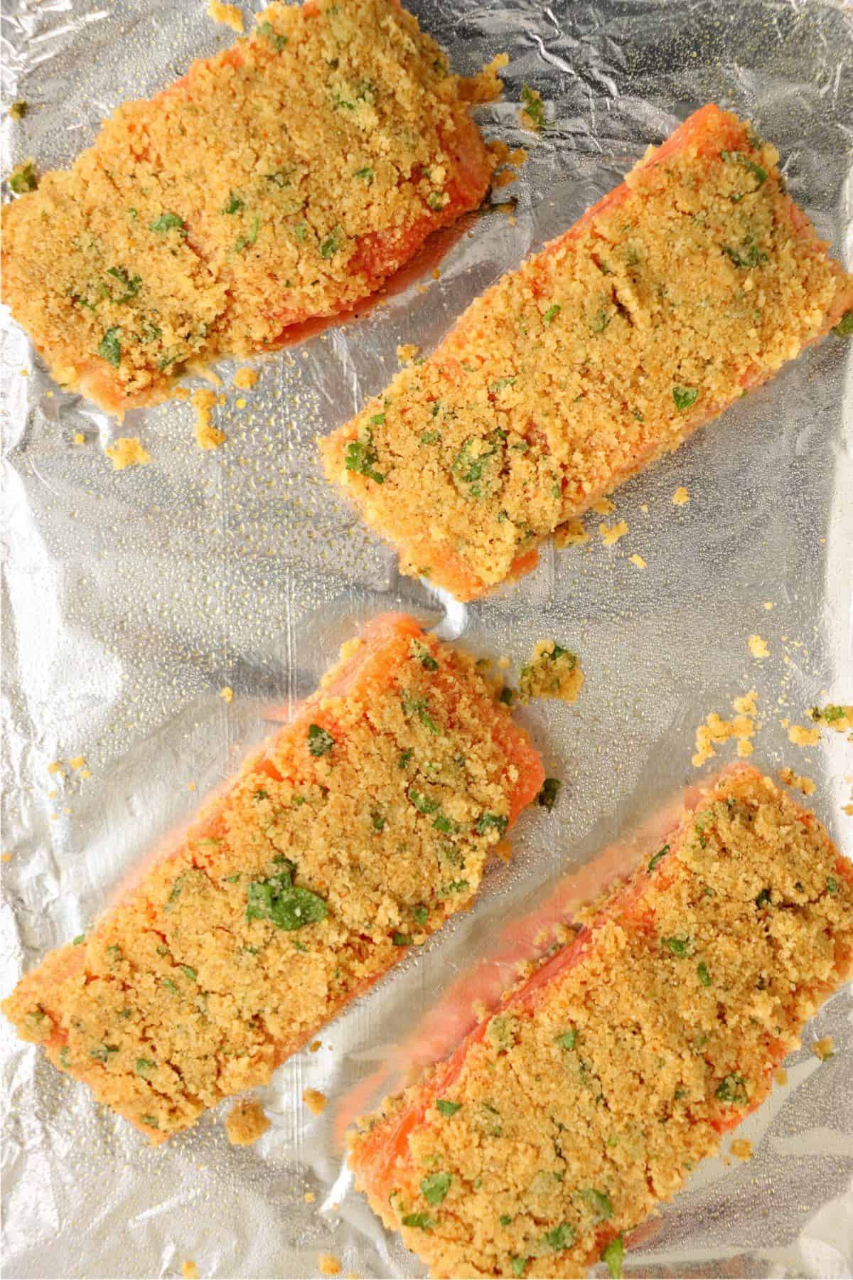 - Place breaded salmon filets on a baking sheet lined with aluminum foil and sprayed with non-stick cooking spray.