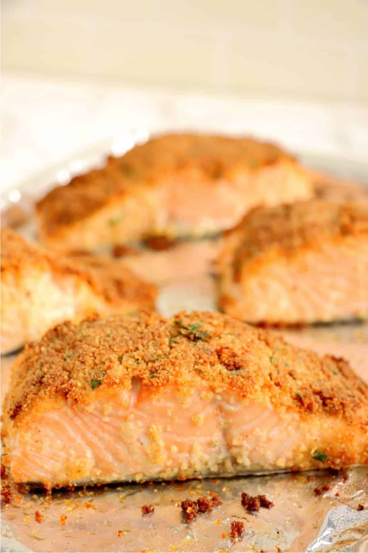 This easy herb crusted salmon coats flaky salmon filets with an herb and parmesan breadcrumb mixture for a crispy, delicious finish.