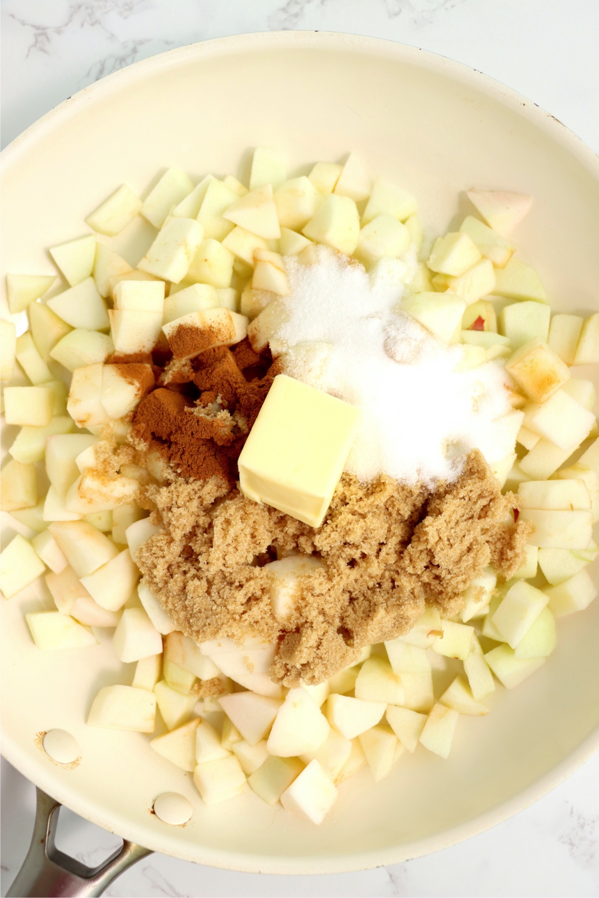 - Add apples, butter, brown sugar, ¼ cup sugar, and 1 tsp cinnamon to a large skillet.