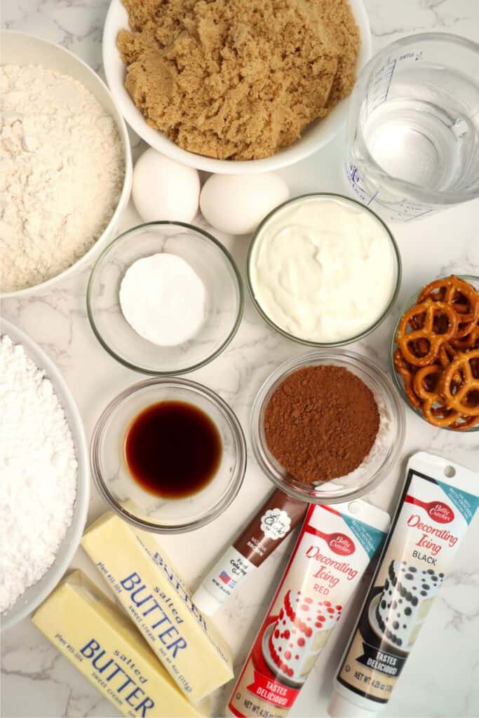 - Pretzels, Red Frosting, and Black Frosting: To make the antlers, nose, and eyes.