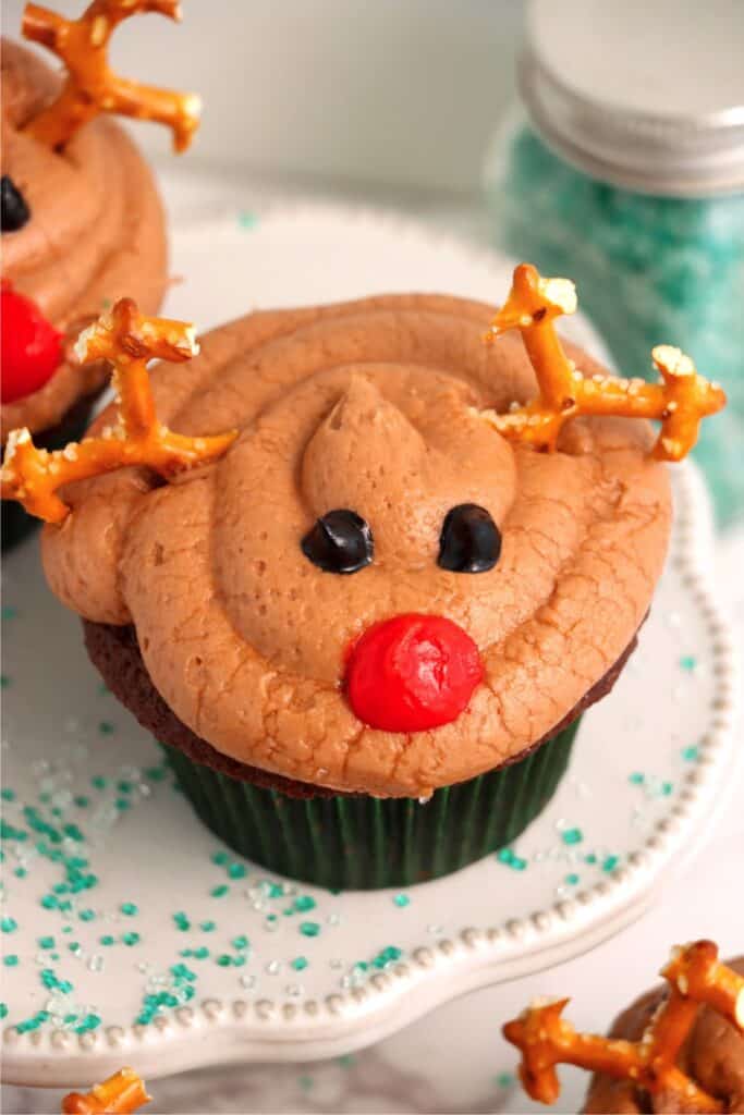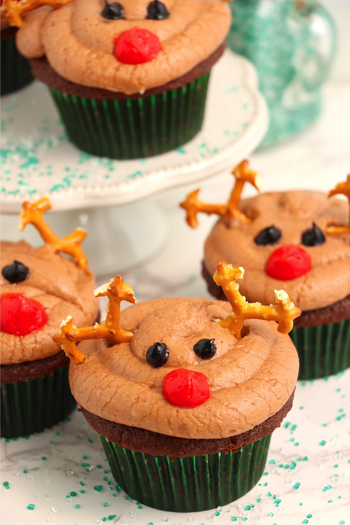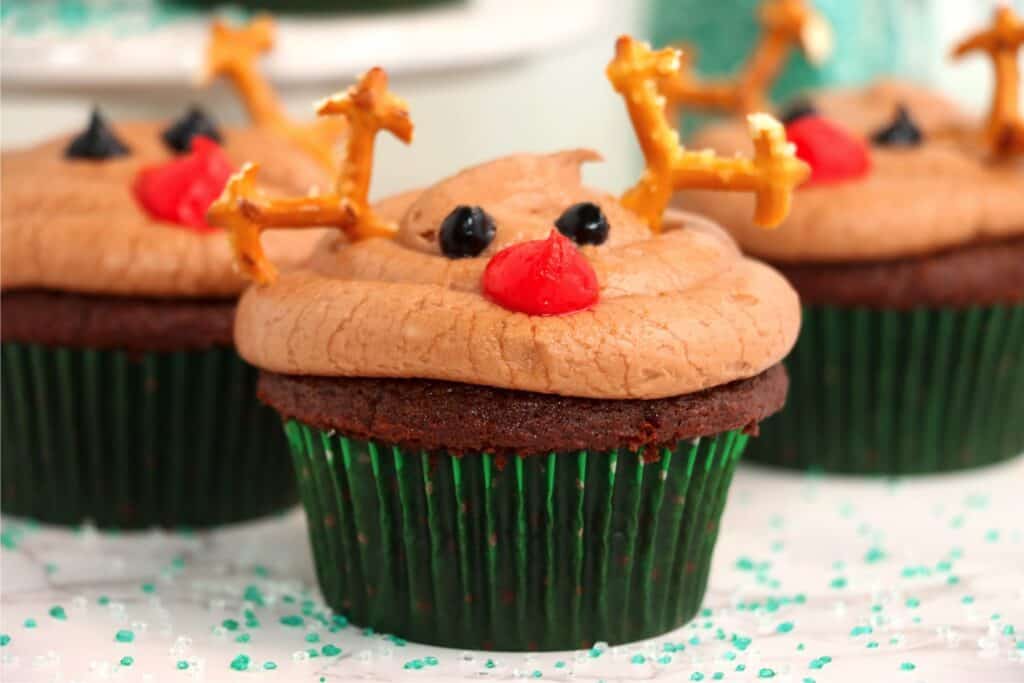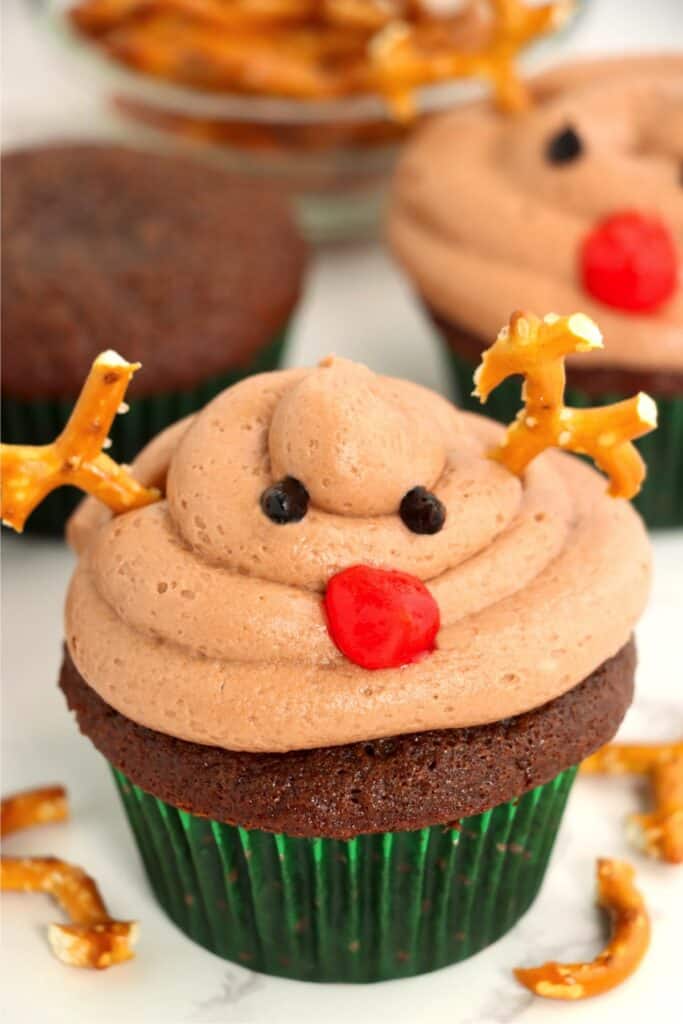 These chocolate reindeer cupcakes combine a tender, moist chocolate cupcake, rich buttercream frosting, and pretzels to create a cupcake that's as festive as it is delicious.