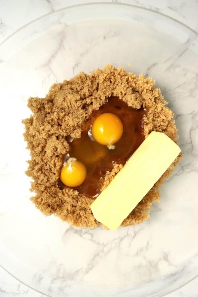 - In a large mixing bowl, cream brown sugar, eggs, and butter together until fluffy.
