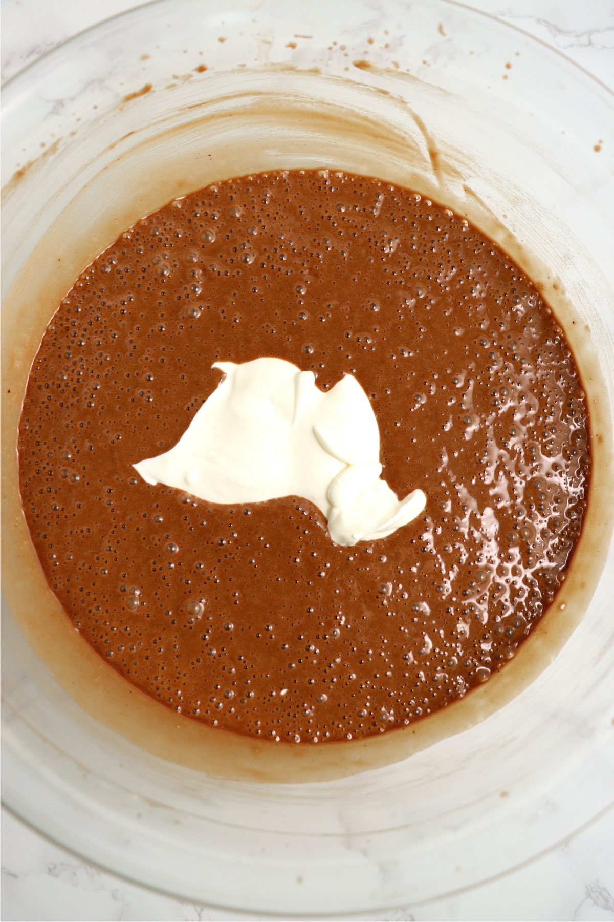 1. Cream the butter, sugar, and eggs. Then, add the cocoa powder and boiling water. Finally, add flour and baking soda, beat, and add sour cream, beating again.