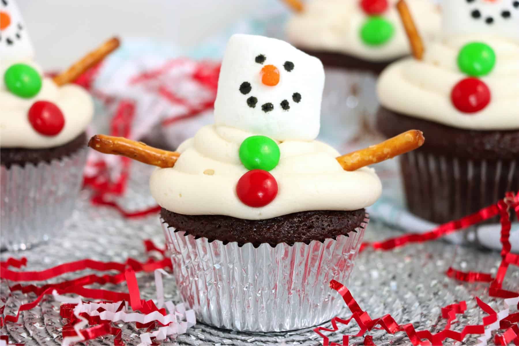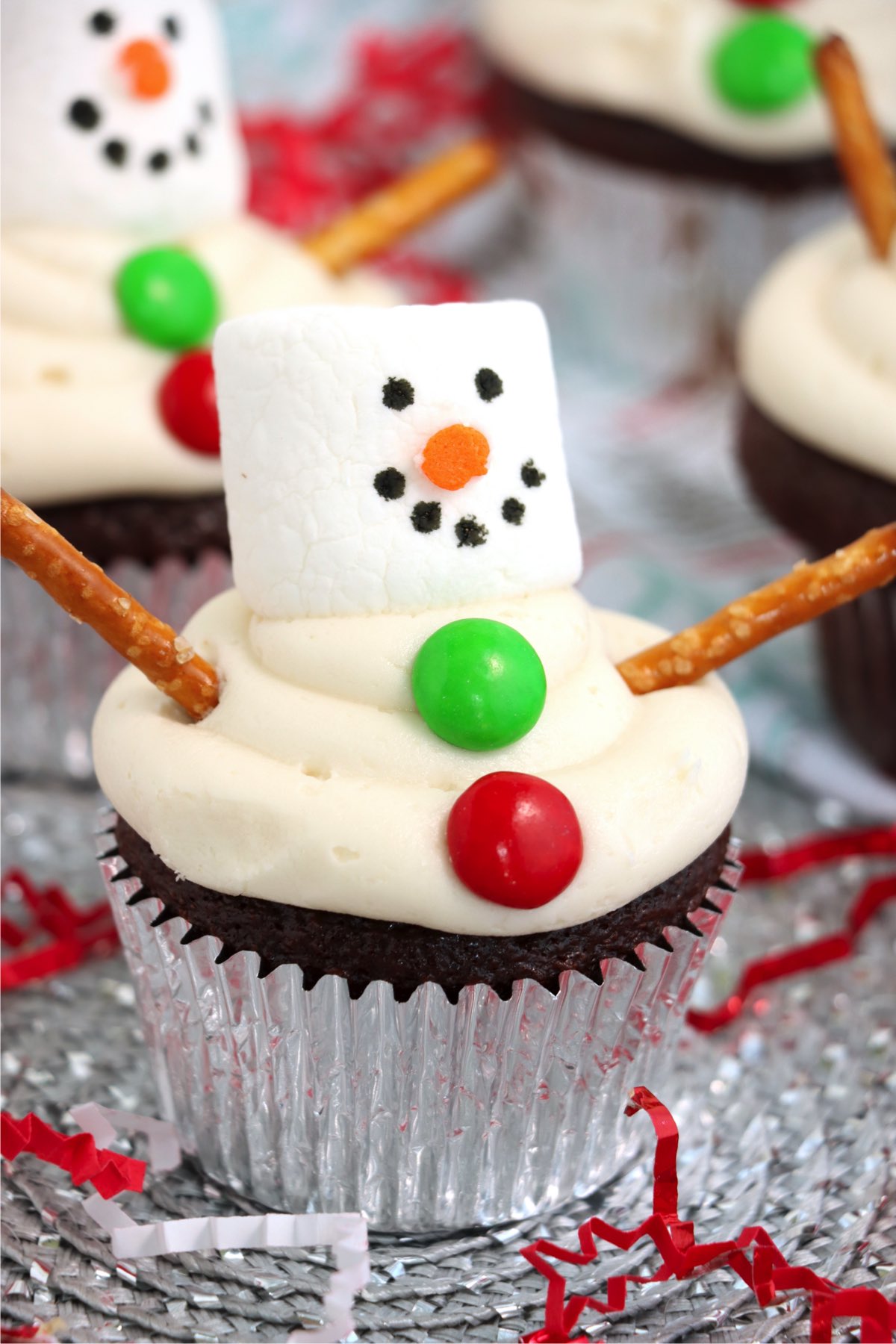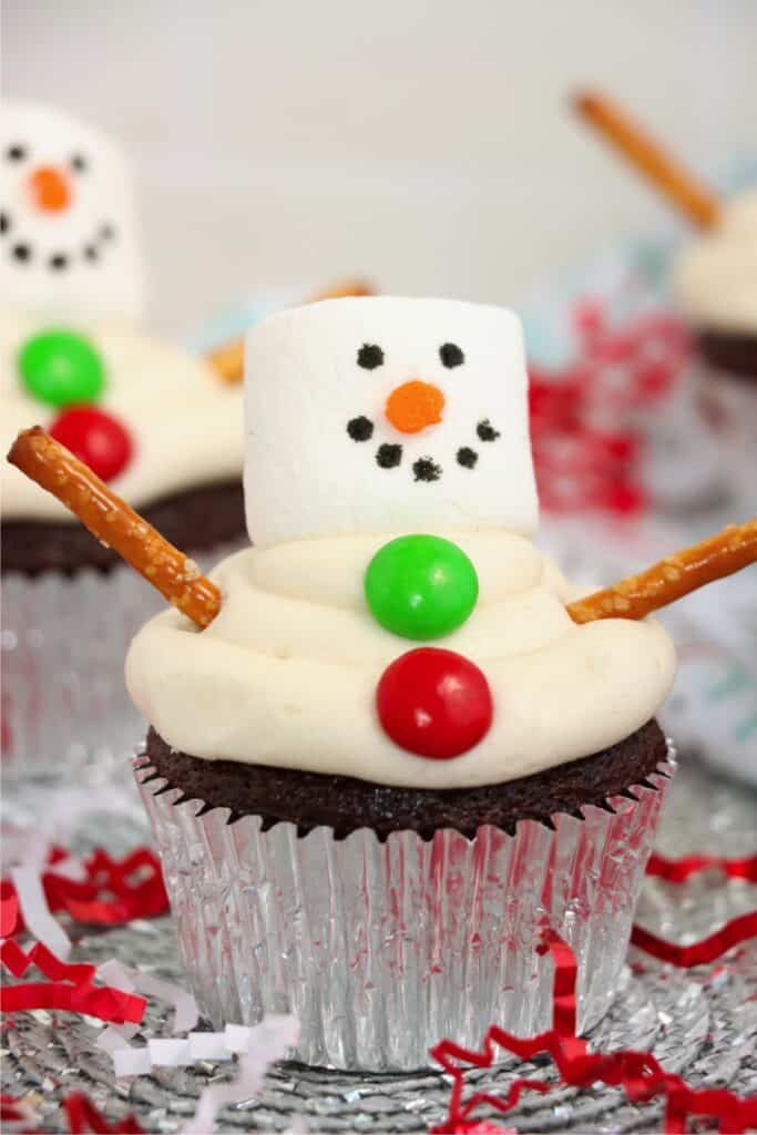 These delicious chocolate snowman cupcakes are as festive as they are delicious. Tender, moist chocolate cupcakes are topped with sweet buttercream frosting and decorated with marshmallows, pretzel sticks, and M&Ms to look just like snowmen!