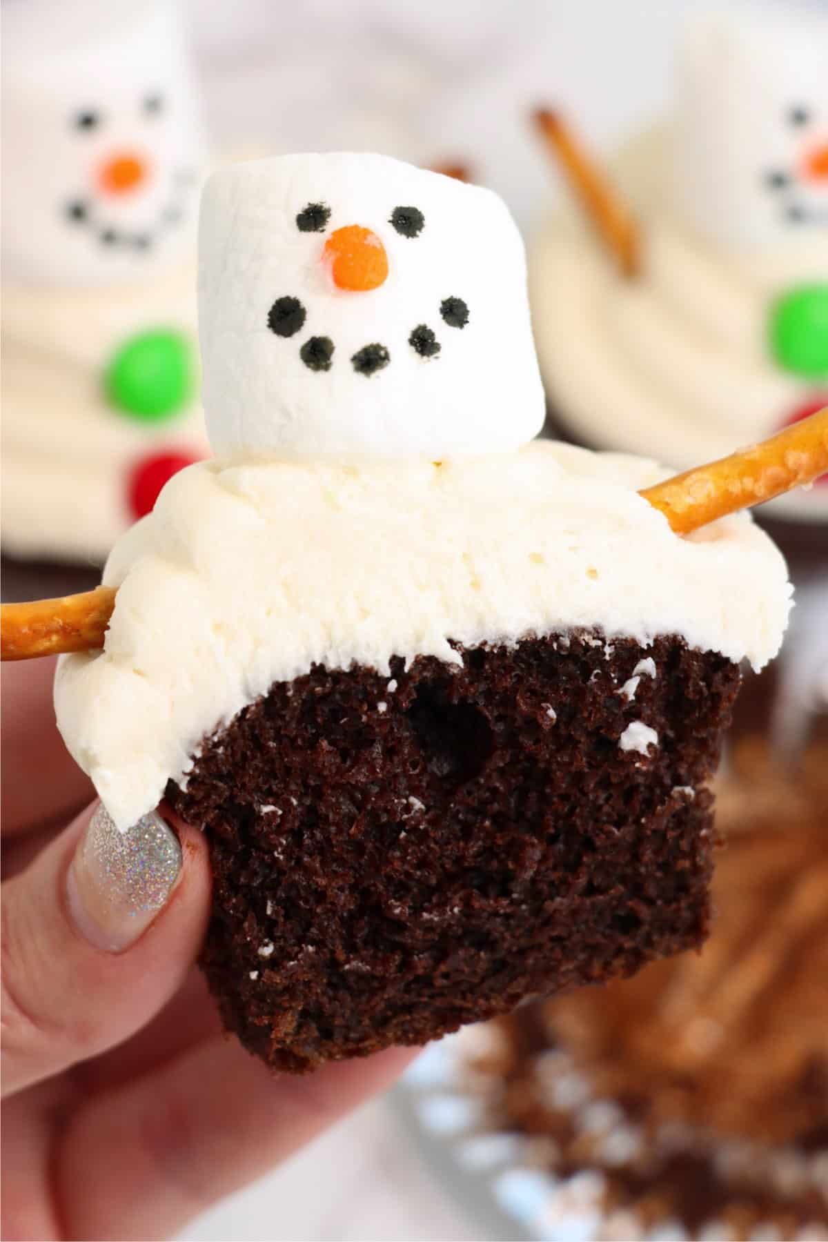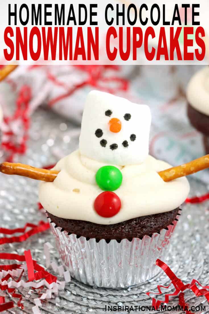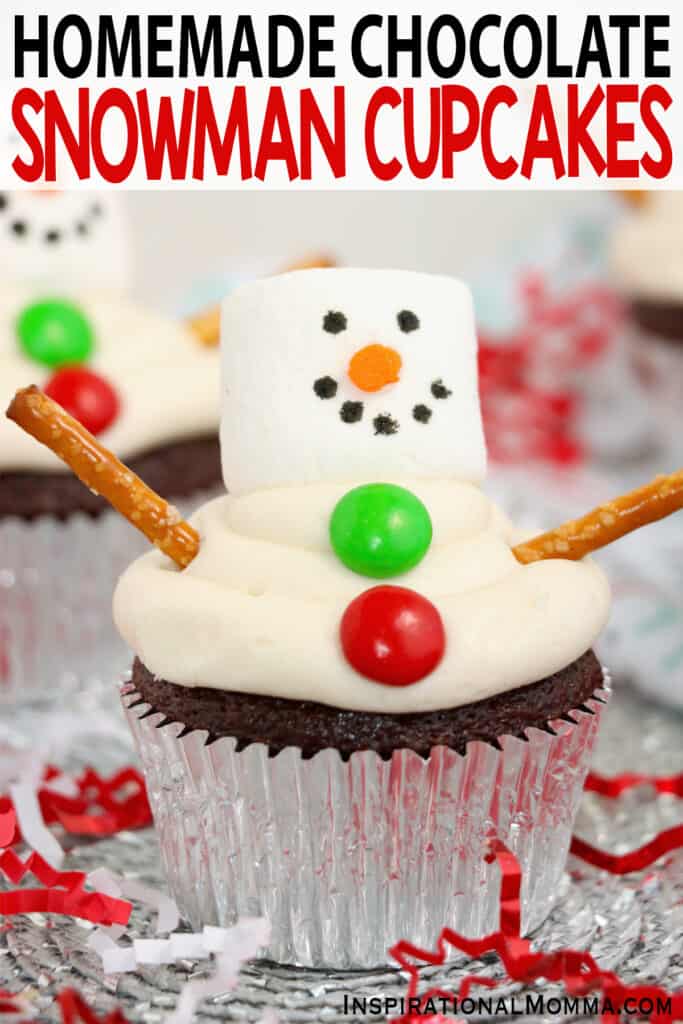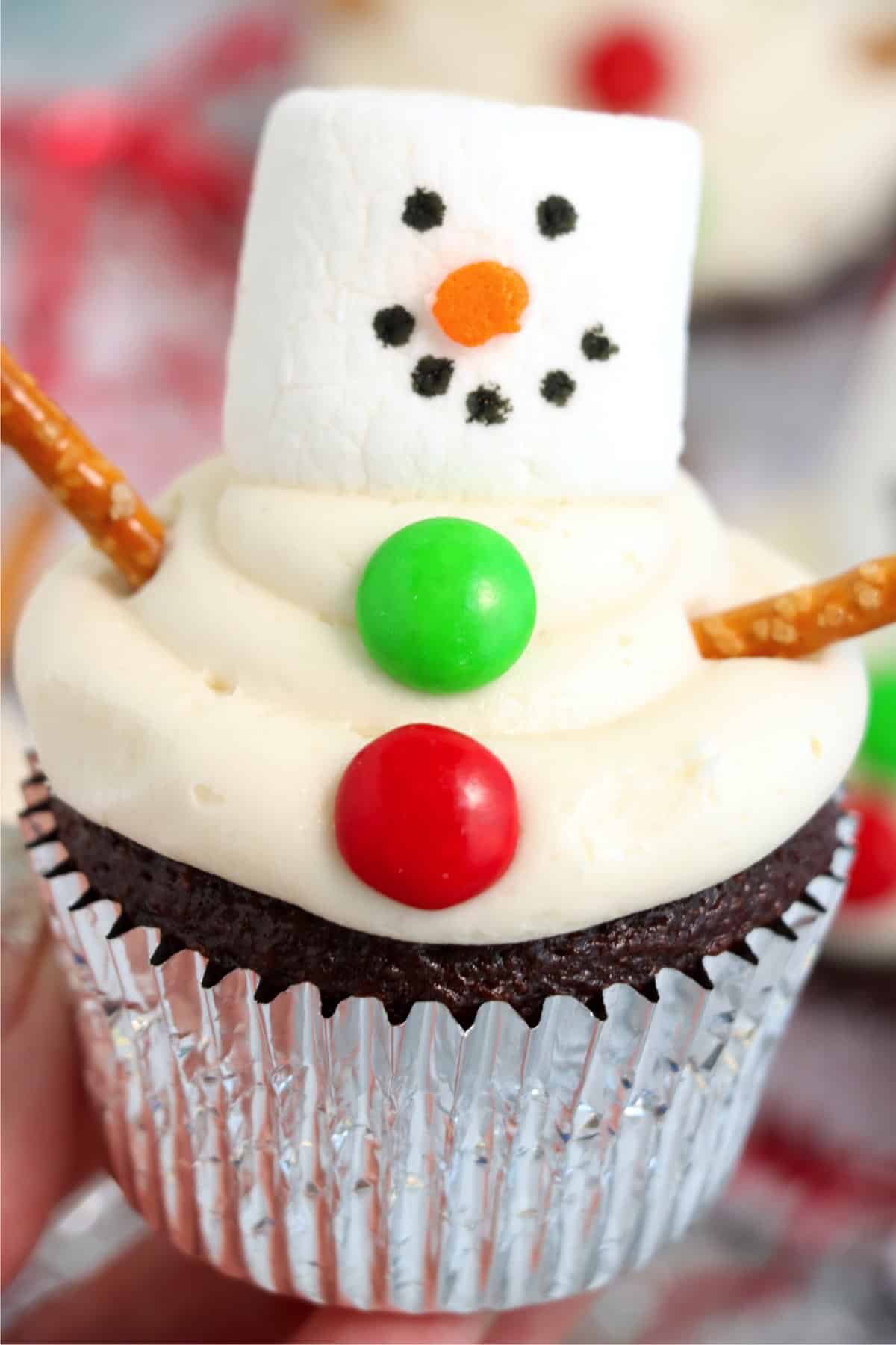 These delicious chocolate snowman cupcakes are as festive as they are delicious. Tender, moist chocolate cupcakes are topped with sweet buttercream frosting and decorated with marshmallows, pretzel sticks, and M&Ms to look just like snowmen!