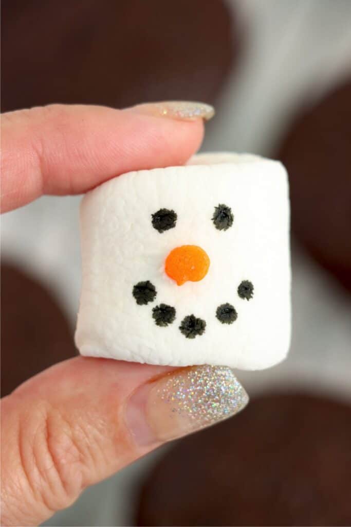 6. Decorate the marshmallow by securing an orange sprinkle to the center with a dab of frosting and using the black edible pen to draw on the eyes and mouth.