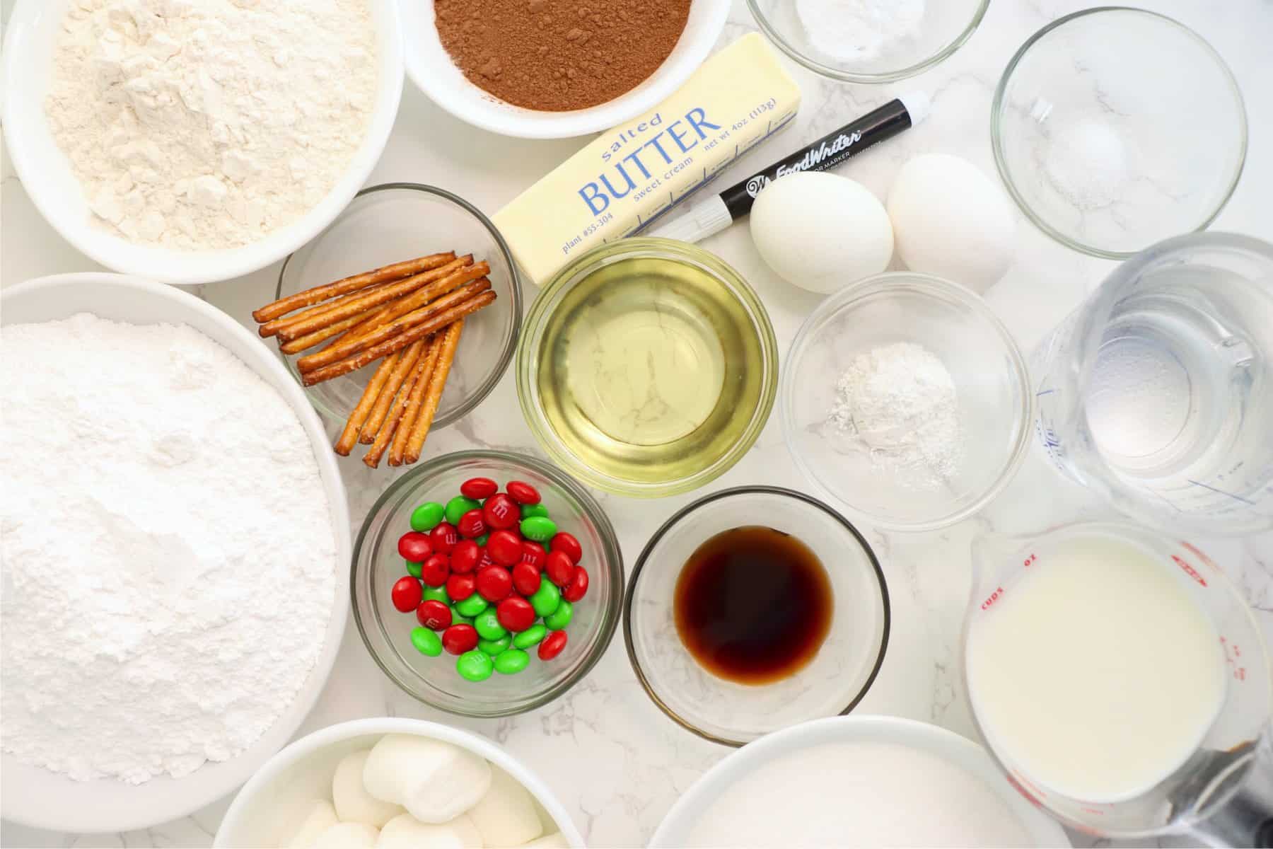 - Add pretzels, M&Ms, and decorated marshmallows.