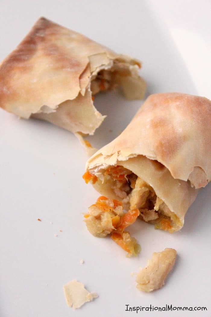 Step 4: Build your egg rolls by placing a scoop of the veggie mixture on an egg role wrapper. Fold the sides in, the bottom up, and roll into a delicious egg roll.