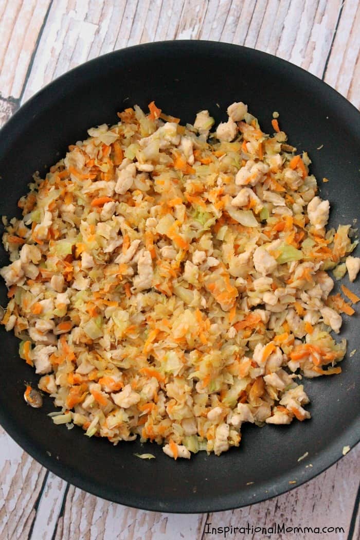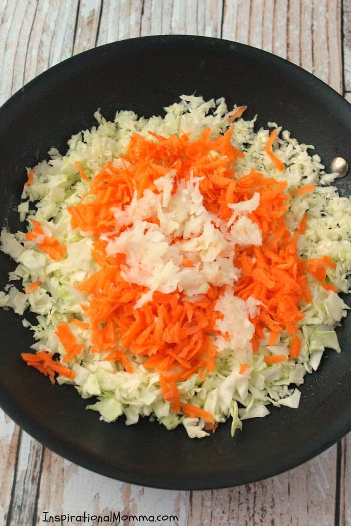 Step 2: In a separate greased skillet, saute cabbage, carrot, onion, and garlic on medium heat for about 7 minutes or until they have softened.