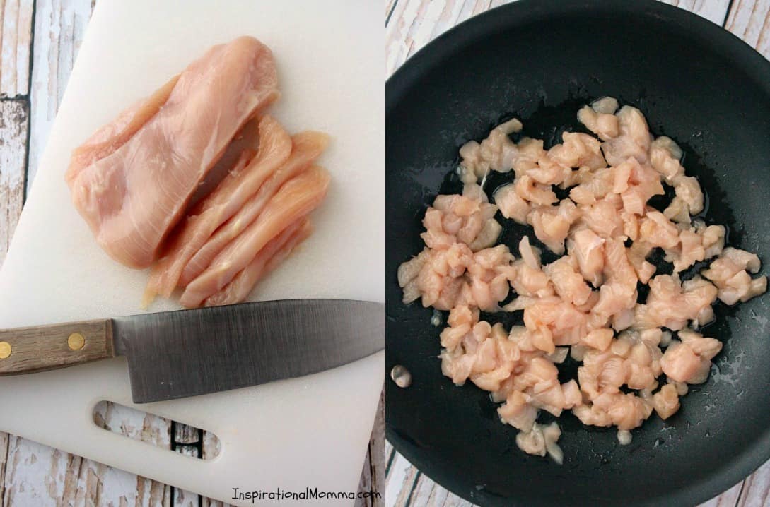 Step 1: In a greased skillet, cook chicken breast. (You could also use pork or shrimp.)