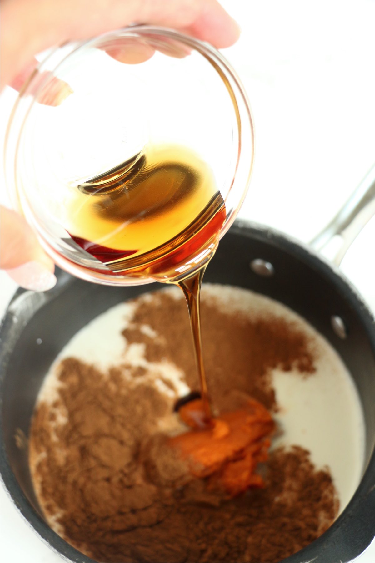 - In a medium saucepan, over medium heat, whisk heavy whipping cream, maple syrup, pumpkin puree, pumpkin pie spice, and cinnamon together until it begins to simmer.