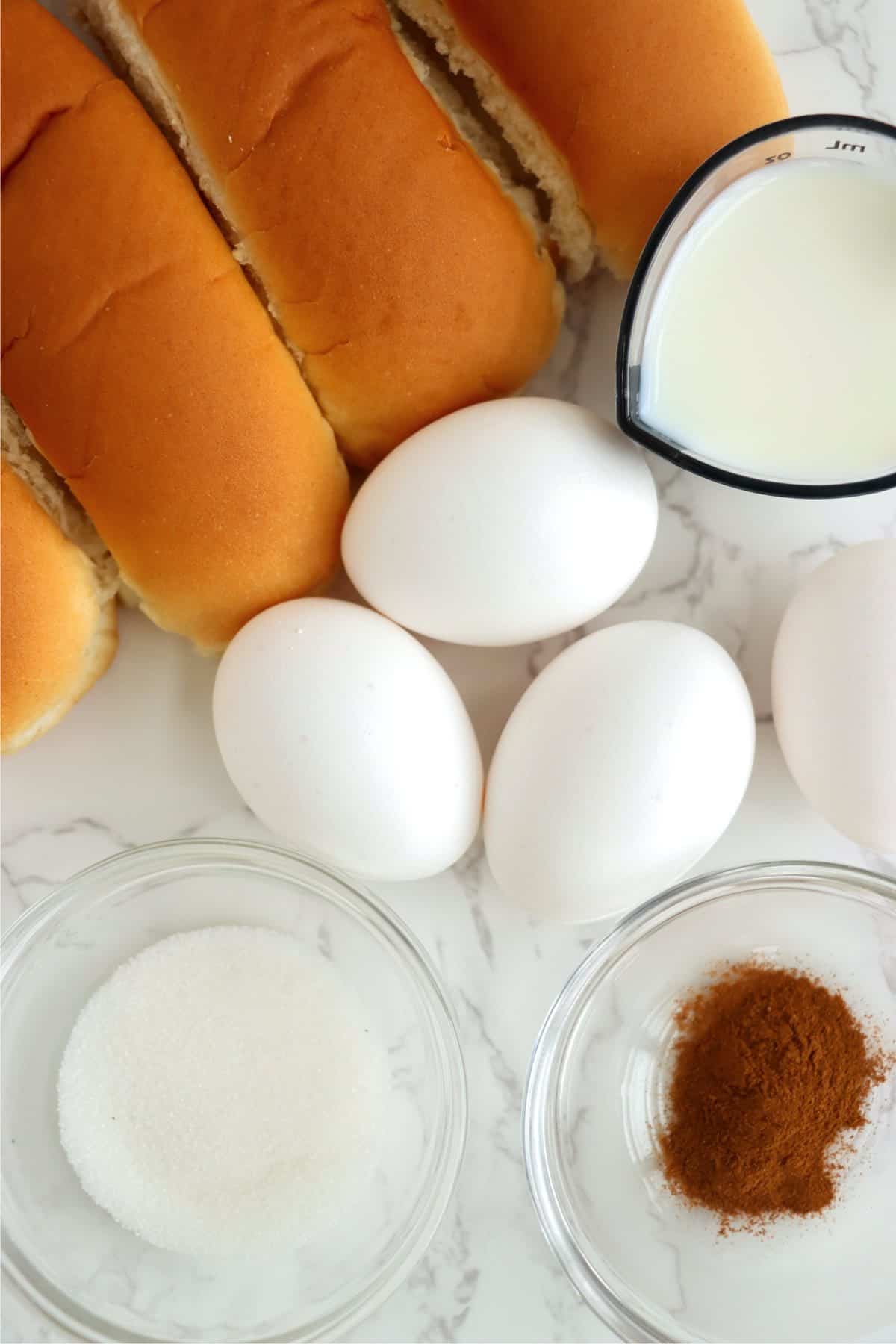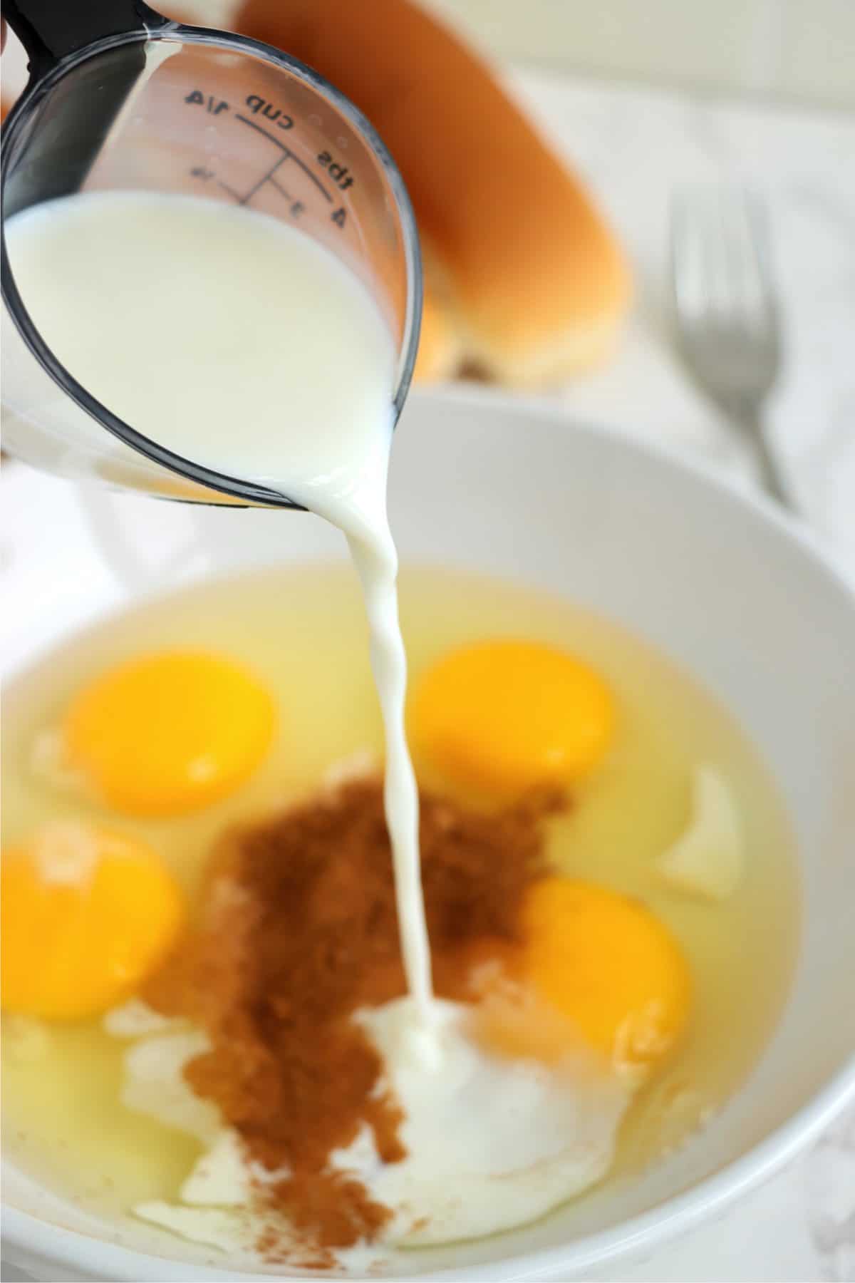 - In a shallow mixing bowl, whisk eggs, milk, sugar, and cinnamon together.