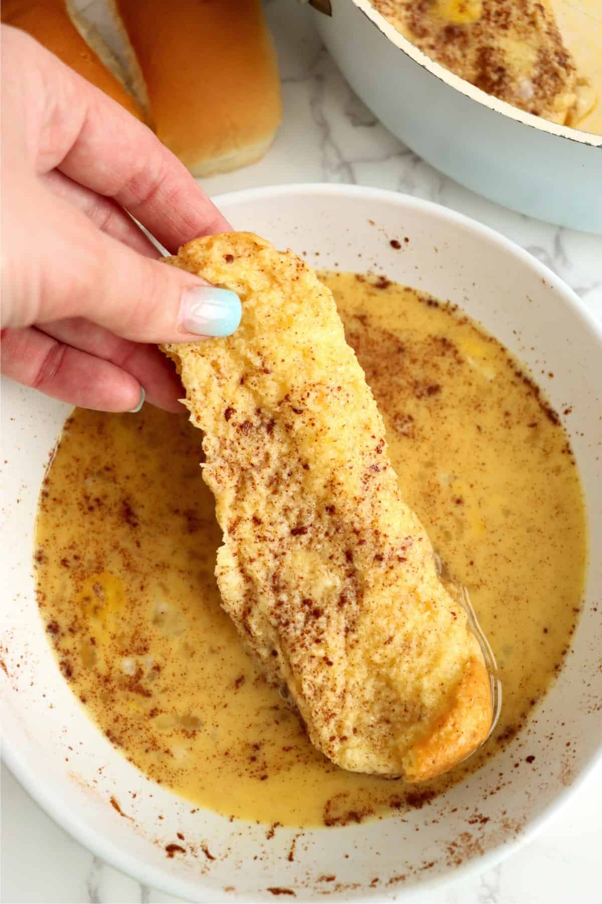 - Soak the buns for about 6 to 8 seconds. You want it to soak up the egg but not get soggy.