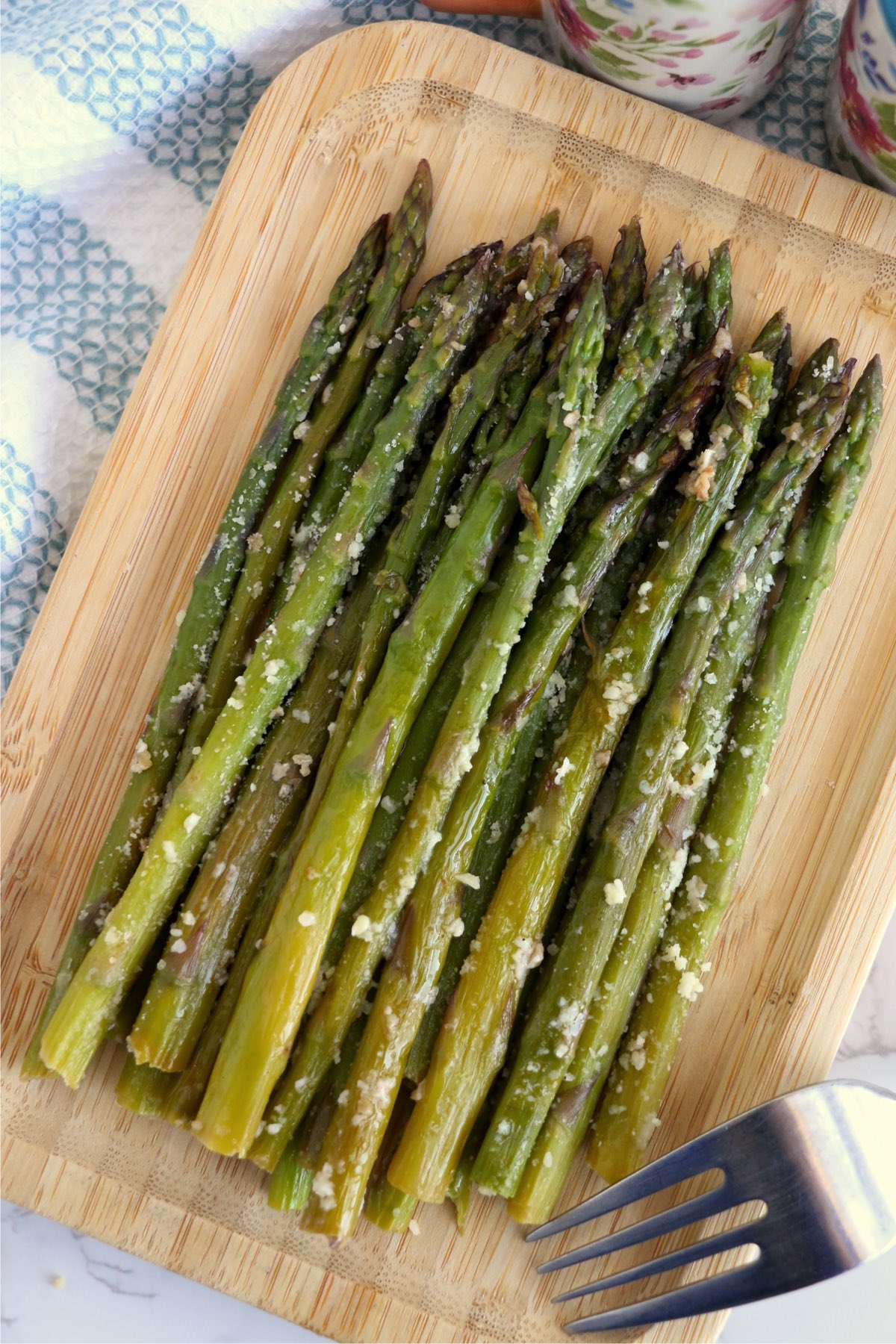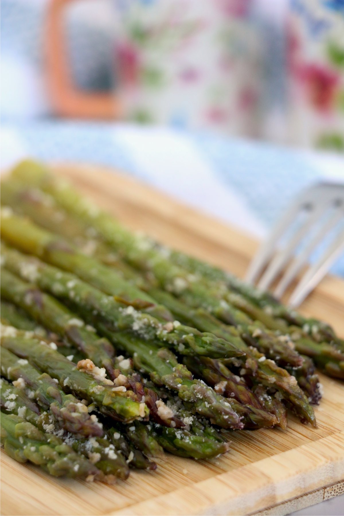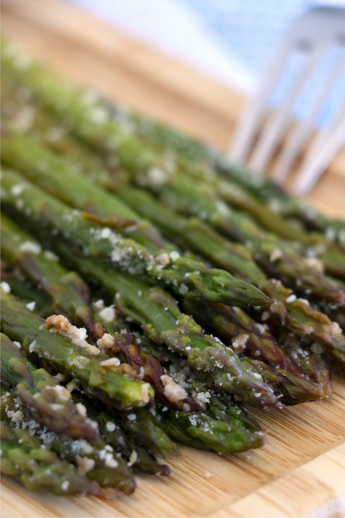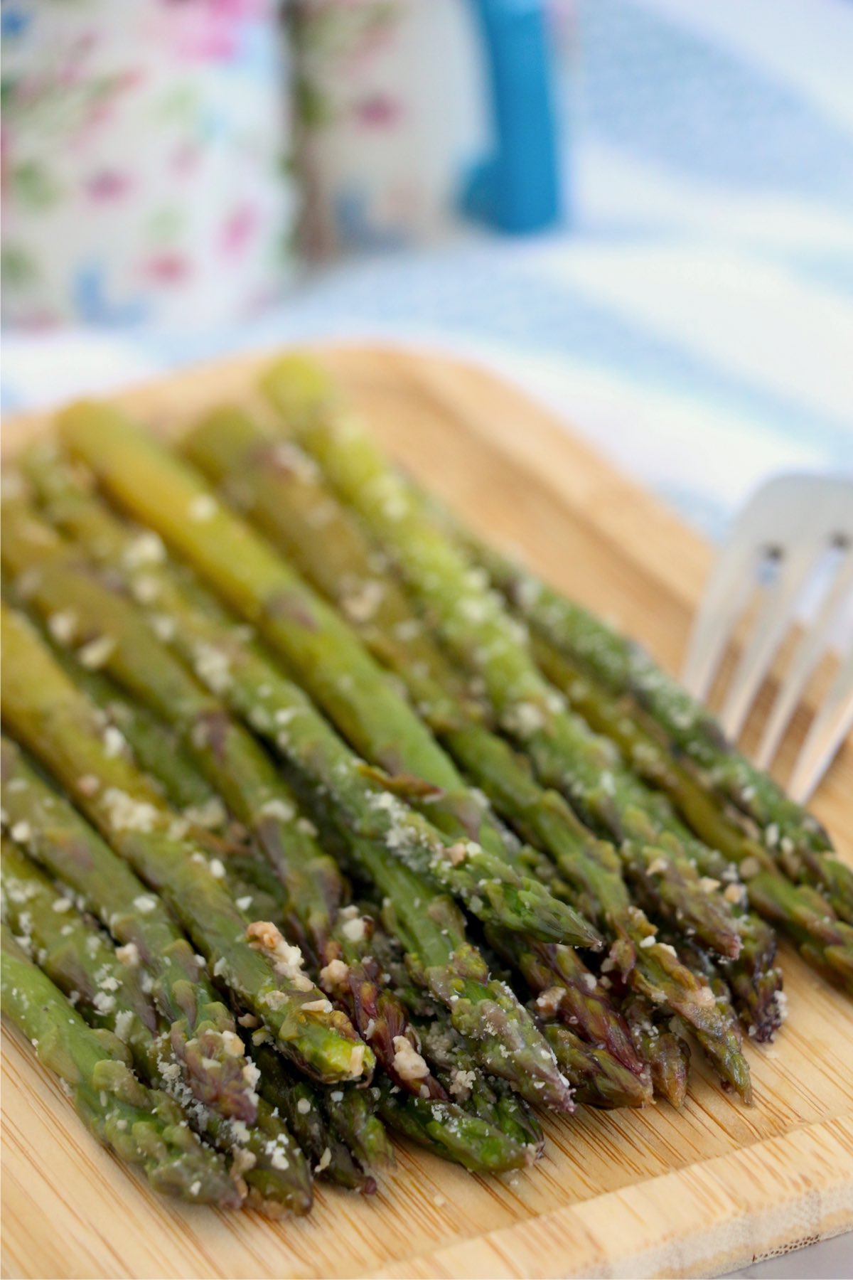 I love asparagus, but unfortunately, I was never able to get my kids to eat it. I figured if I could add some other flavors that they liked, I might be able to entice them to eat it. And I did! They love this asparagus with its garlic and parmesan cheese flavors.