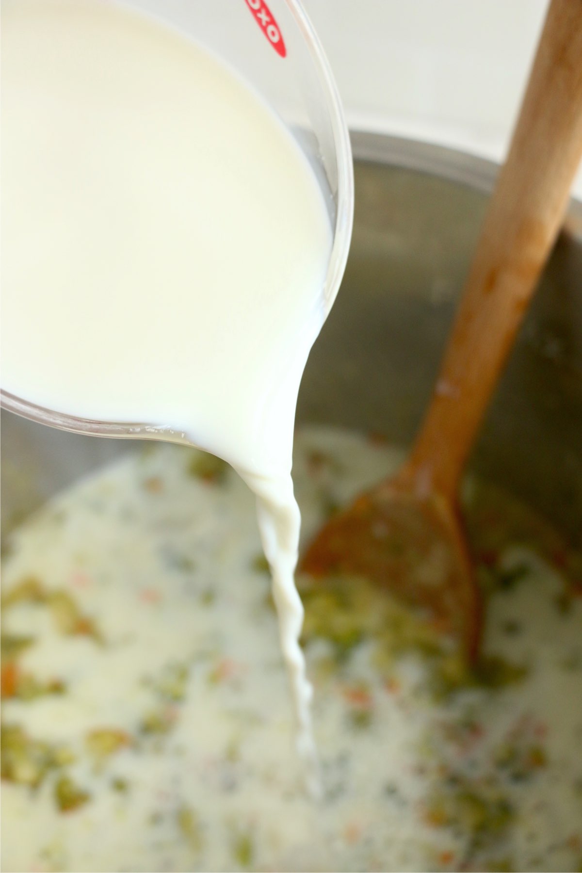 - Heat up your milk in the microwave until very warm, but DO NOT BOIL. This will prevent the milk from curdling when adding it to the hot soup.