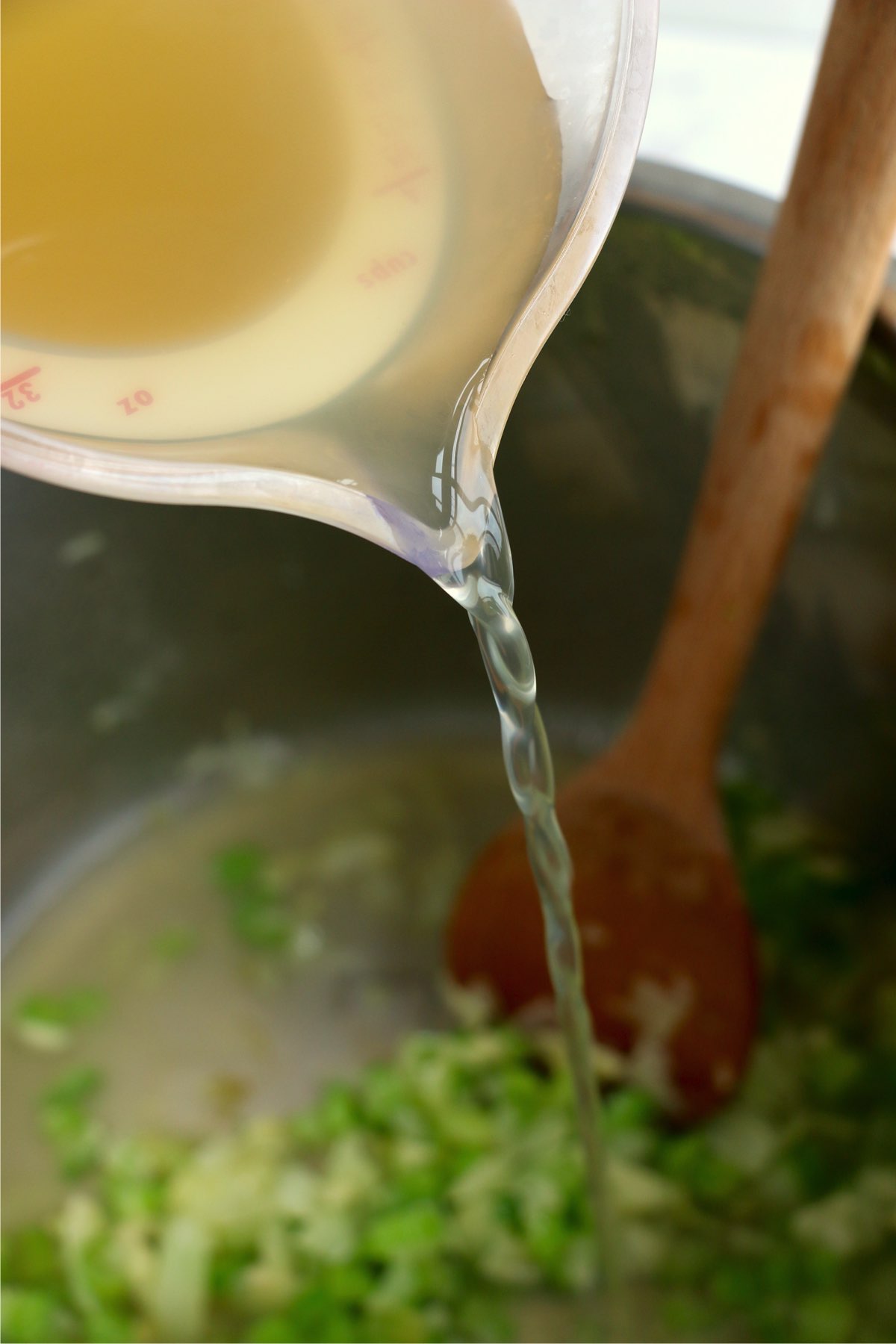 Step 5: Add chicken broth to the cooked onions, garlic, and celery.