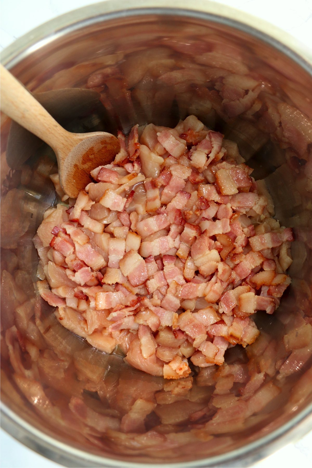 Step 2: Add chicken and 1 1/2 cups bacon. SAUTE for 5 minutes.