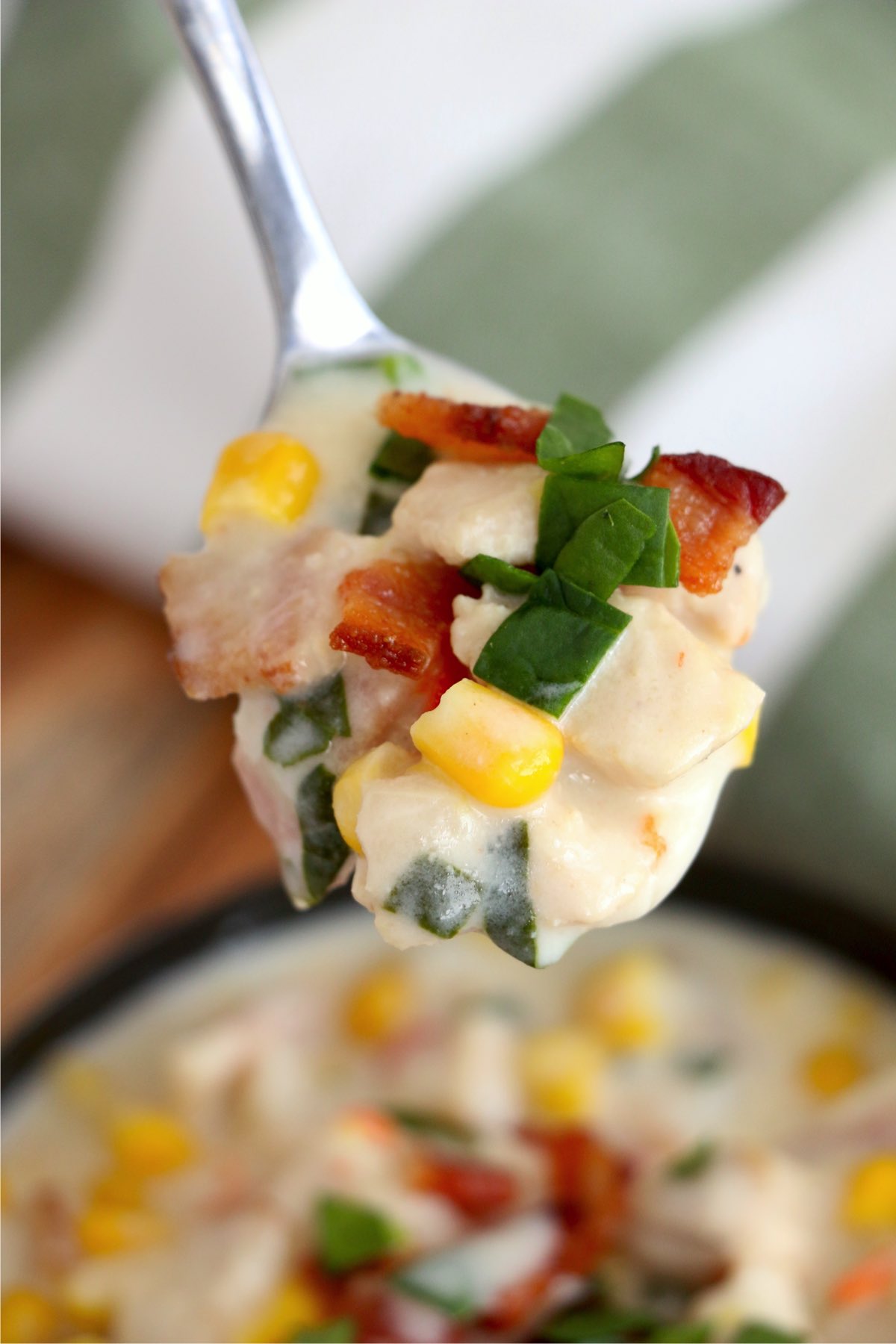 Top with bacon and fresh spinach before serving. - OPTIONAL: If you choose to thicken your chowder a bit more, switch your instant pot to SAUTE. While the chowder is coming to a boil, in a glass, add 2 tablespoons cornstarch to 1/2 cup water and stir until all lumps are gone. When the chowder is at a slow boil, slowly stir in the cornstarch mixture. Continue to boil for 2 minutes or until chowder thickens.