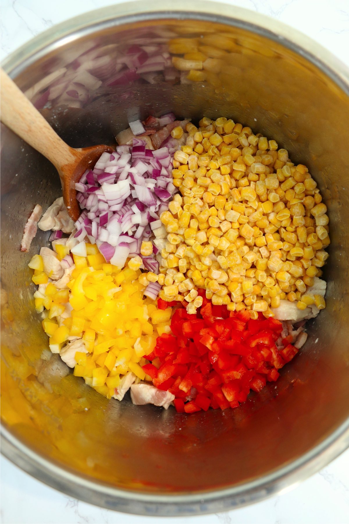 - Add red peppers, yellow peppers, red onion, frozen corn, salt, and pepper. SAUTE for an additional 5 minutes.