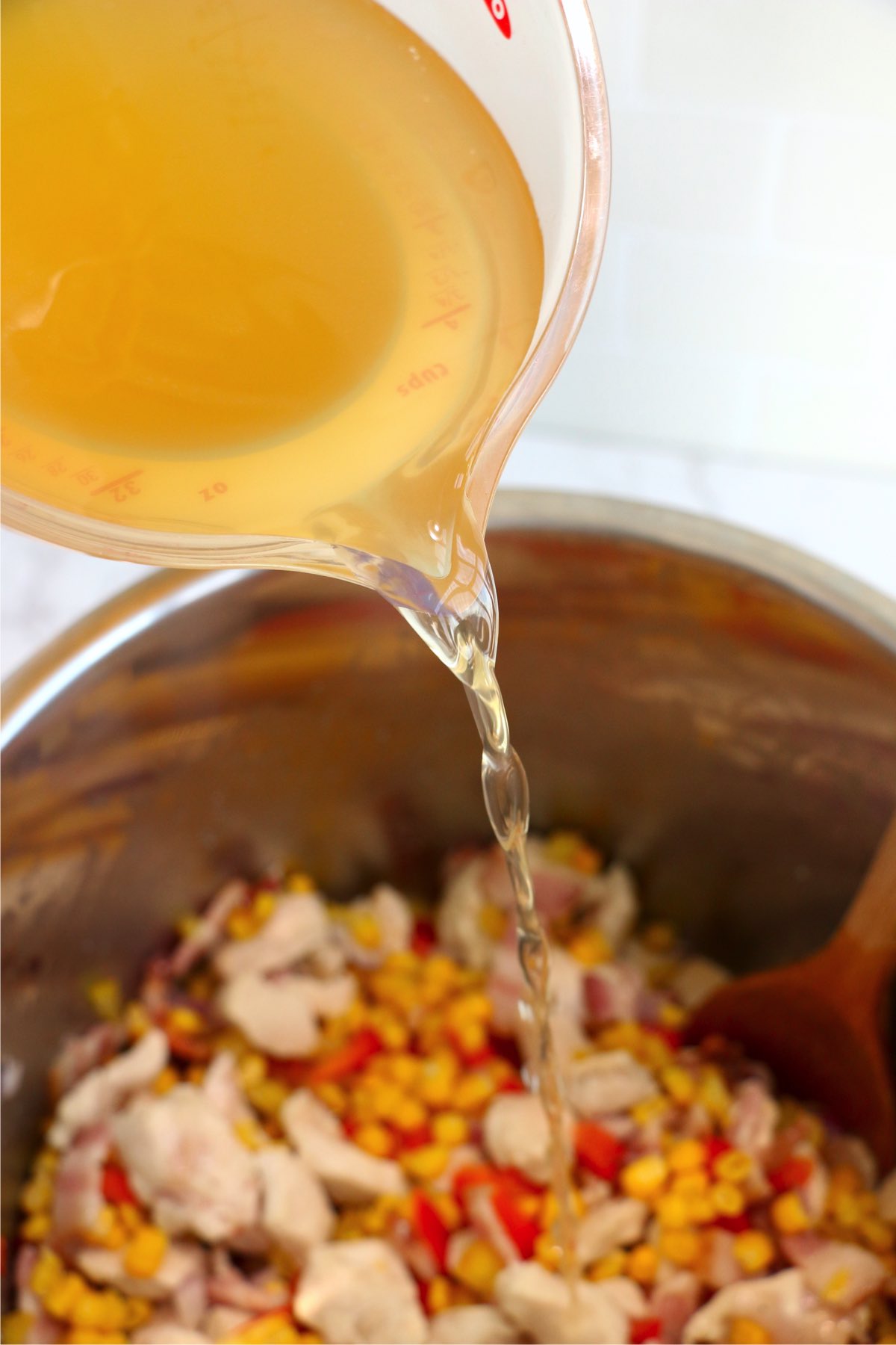 Step 4: Add 4 cups chicken broth and PRESSURE on HIGH for 7 minutes. Then quick release.