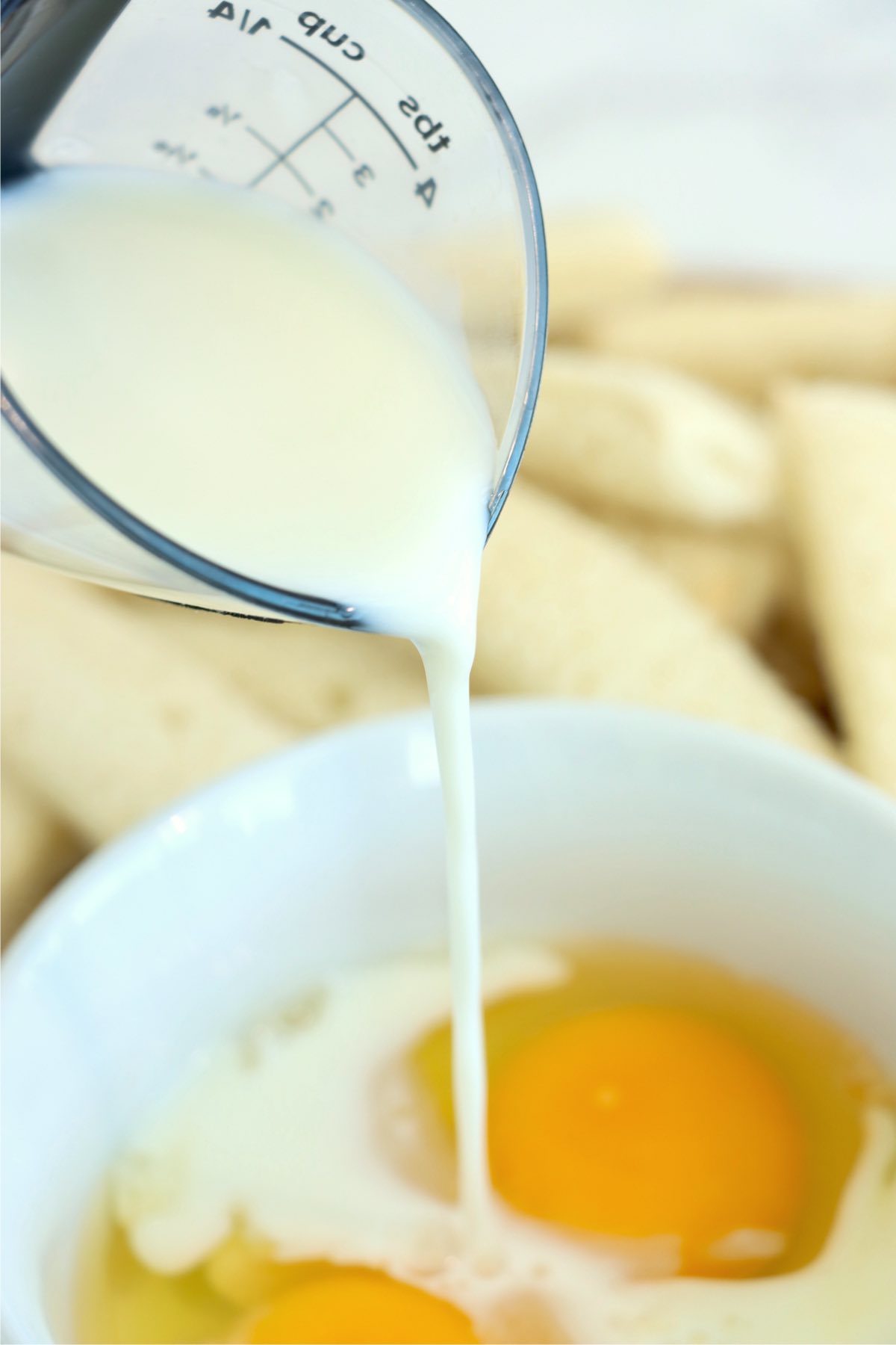- In a small mixing bowl, beat eggs, milk, sugar, and salt.