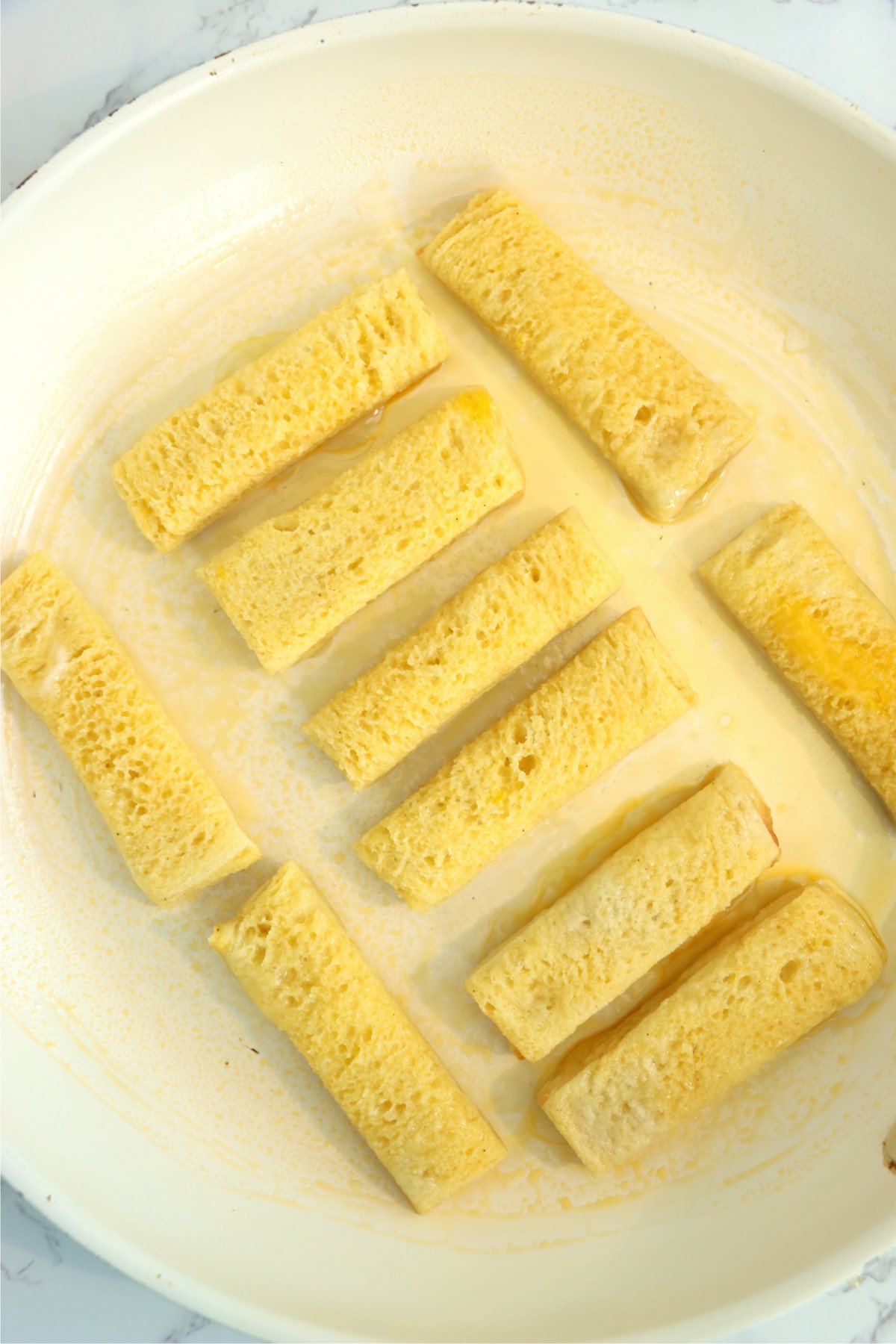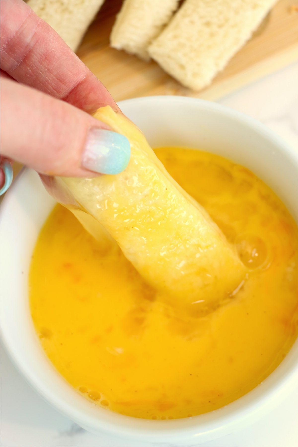 - Dip each strip of bread into the egg mixture until all sides are coated.