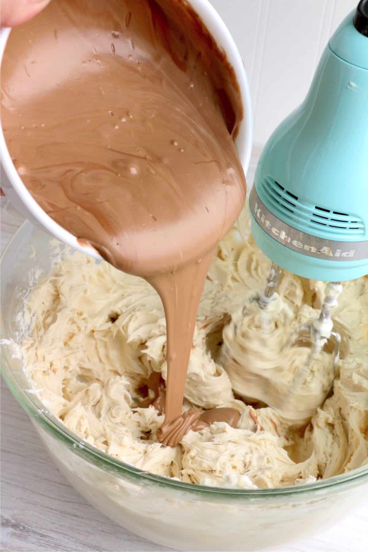 - Pour melted chocolate in a thin stream into the cream cheese mixture while mixing.