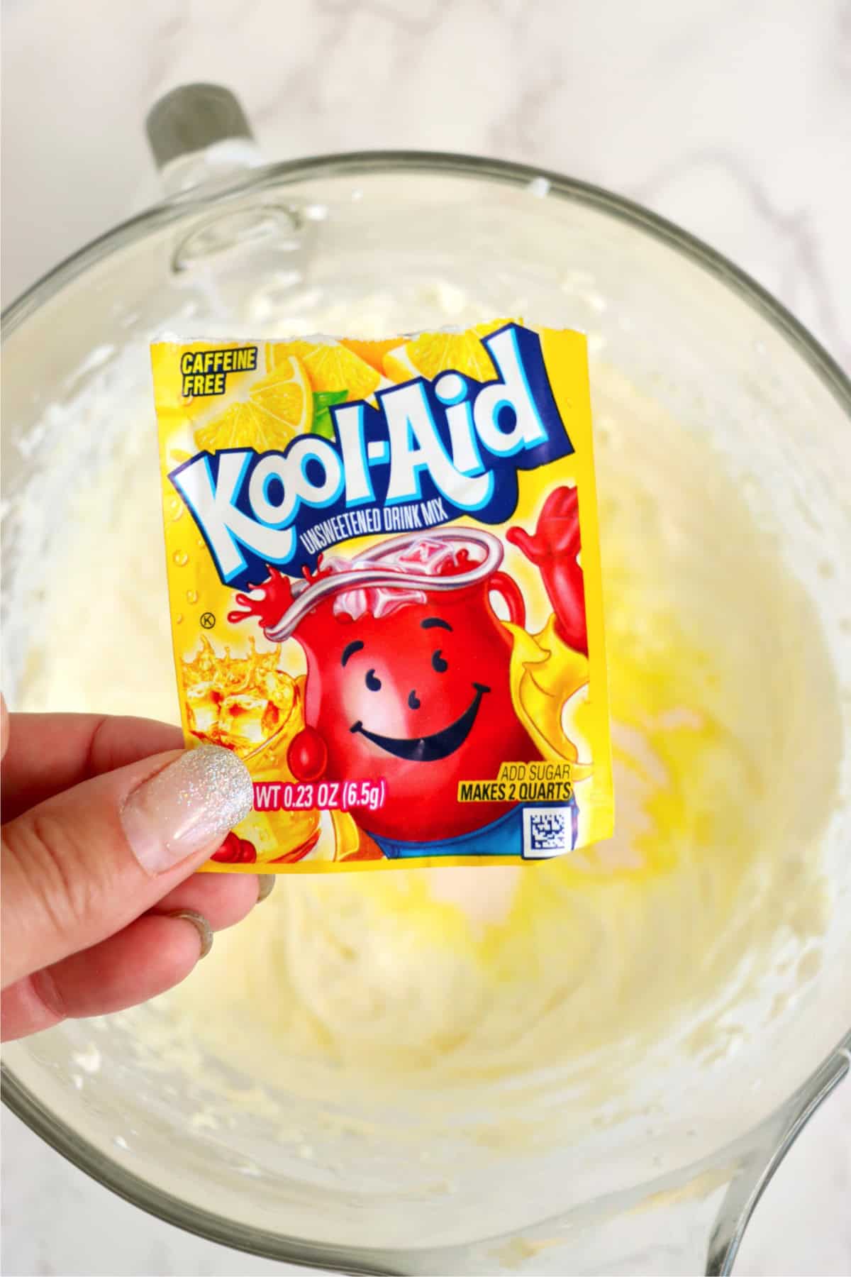 - Add lemonade kool aid packet and beat again.