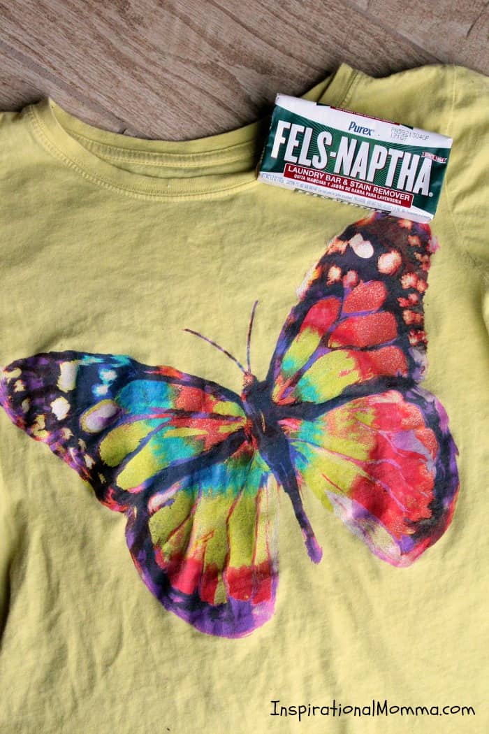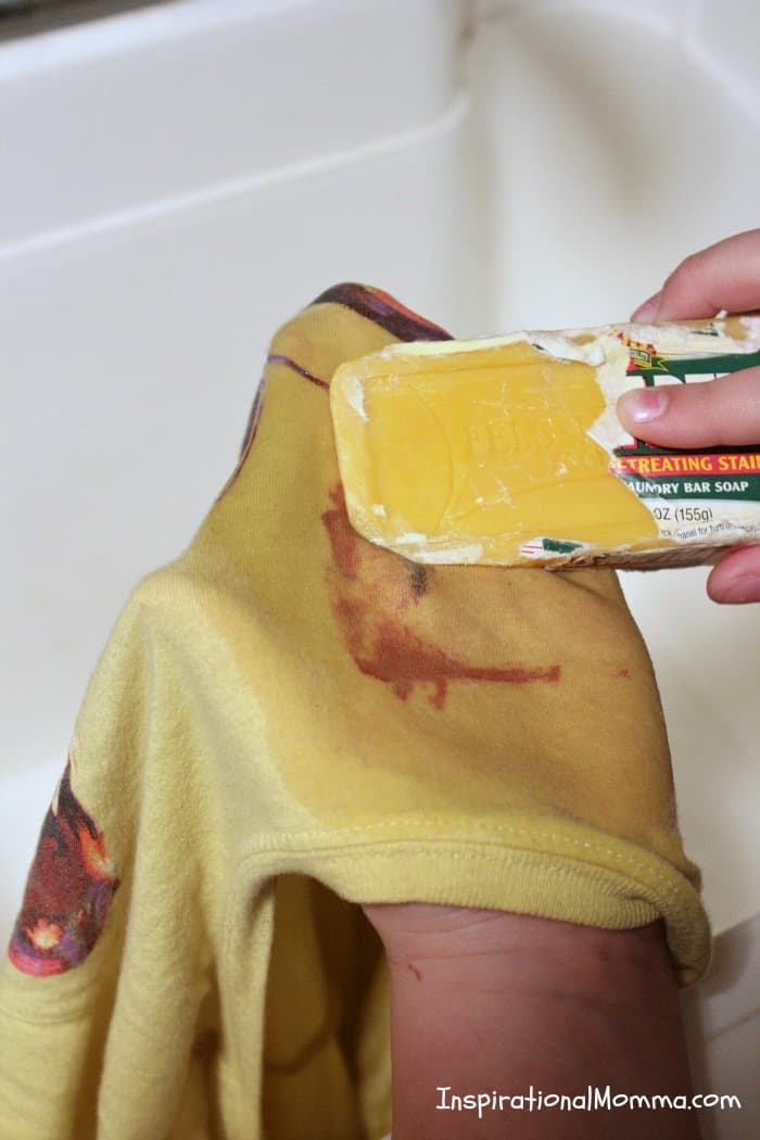 To treat a stain, I simply apply cool water to the affected area and scrub with the Fels-Naptha soap. When I am happy with how it looks, I do not rinse the garment out. I simply toss it into the laundry, wash it with my Easy DIY Powder Laundry Detergent, and enjoy the fresh, clean, stain-free results.