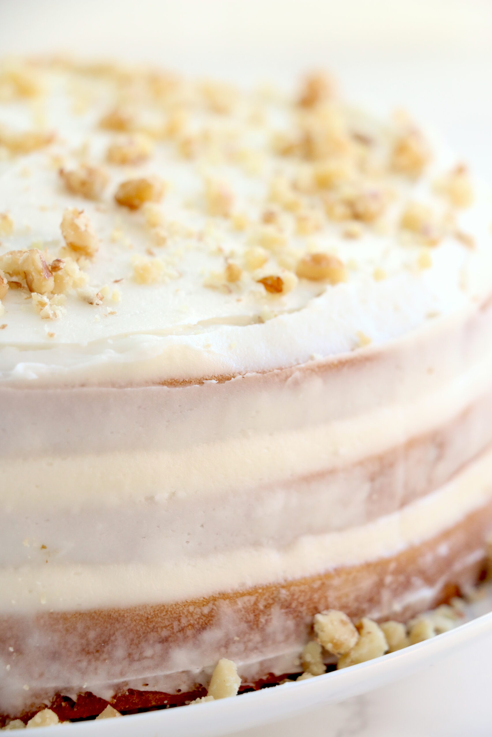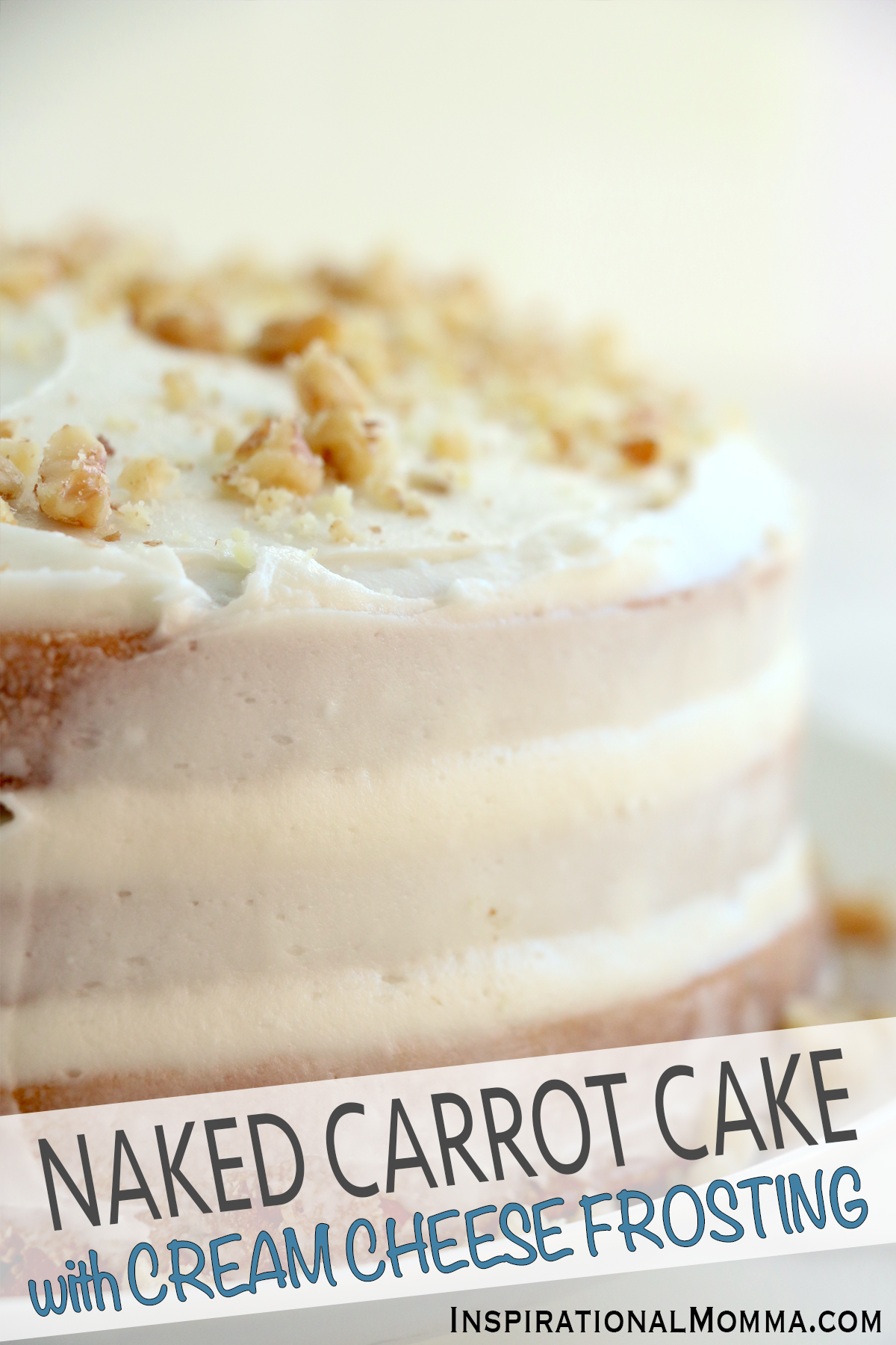 This naked carrot cake with cream cheese frosting has all the classic flavors we love in carrot cake with a chunky twist. Nuts and large shreds of carrot abound in this tender cake, and it's all covered in classic cream cheese frosting.