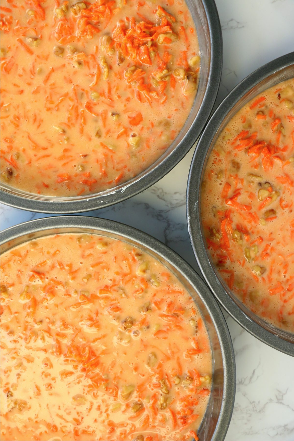 - Prepare three 8.5” round baking pans by greasing them with butter or cooking spray. Set aside.