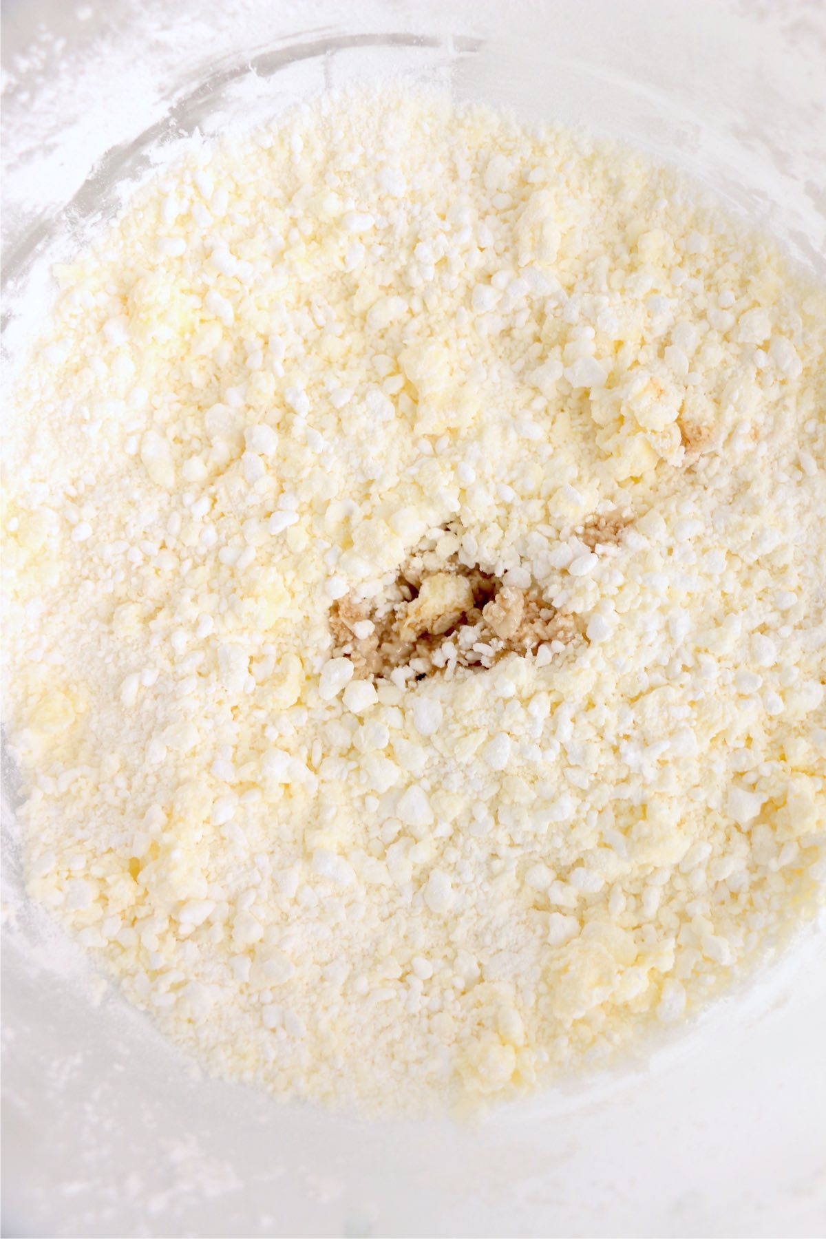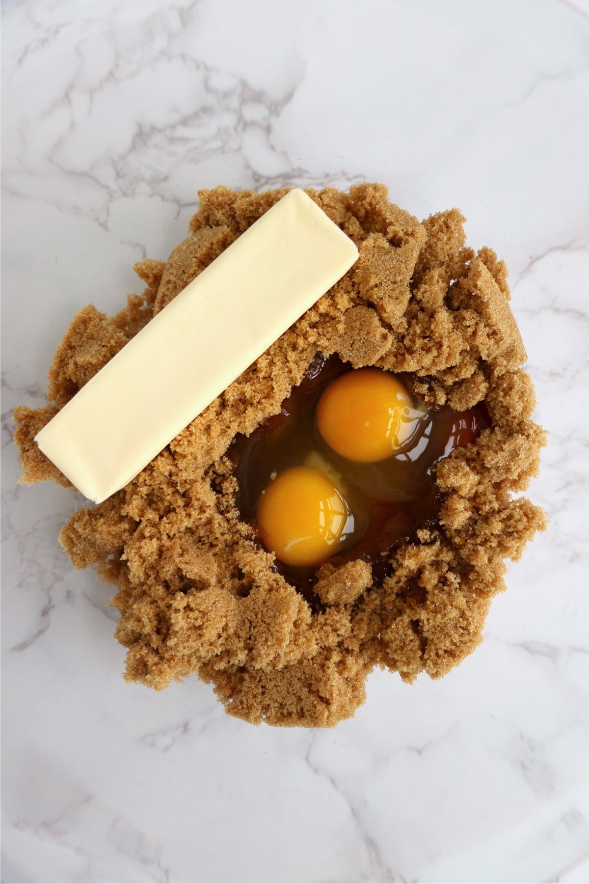 - In a large mixing bowl, combine brown sugar, eggs, and butter with a hand mixer.
