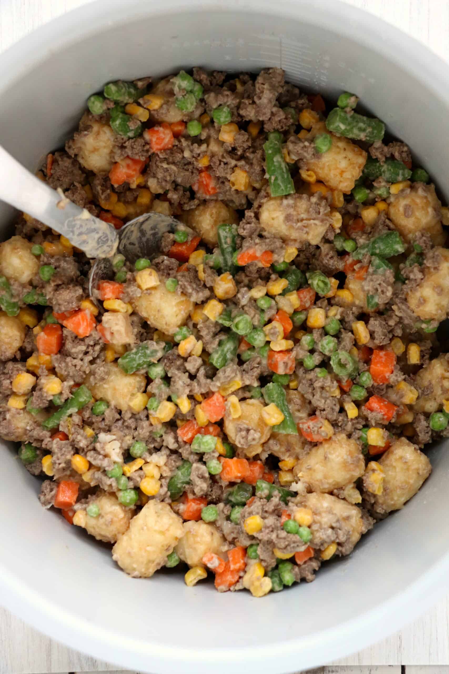 - Add half the tater tots, mixed vegetables, and cream of chicken.
