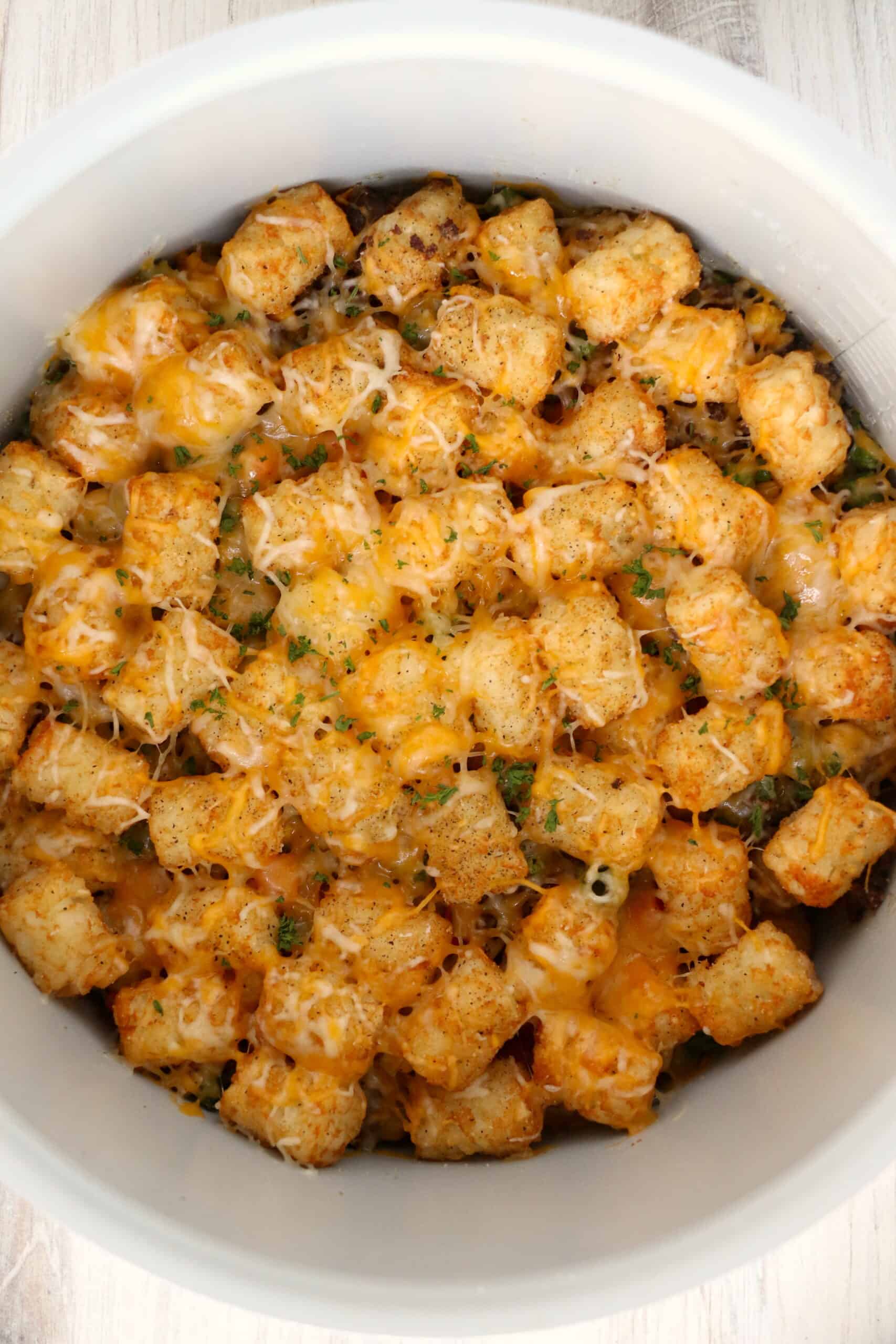 - Top with remaining tater tots.