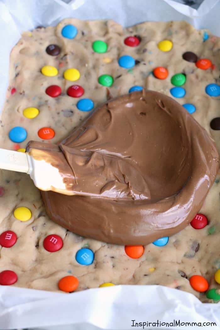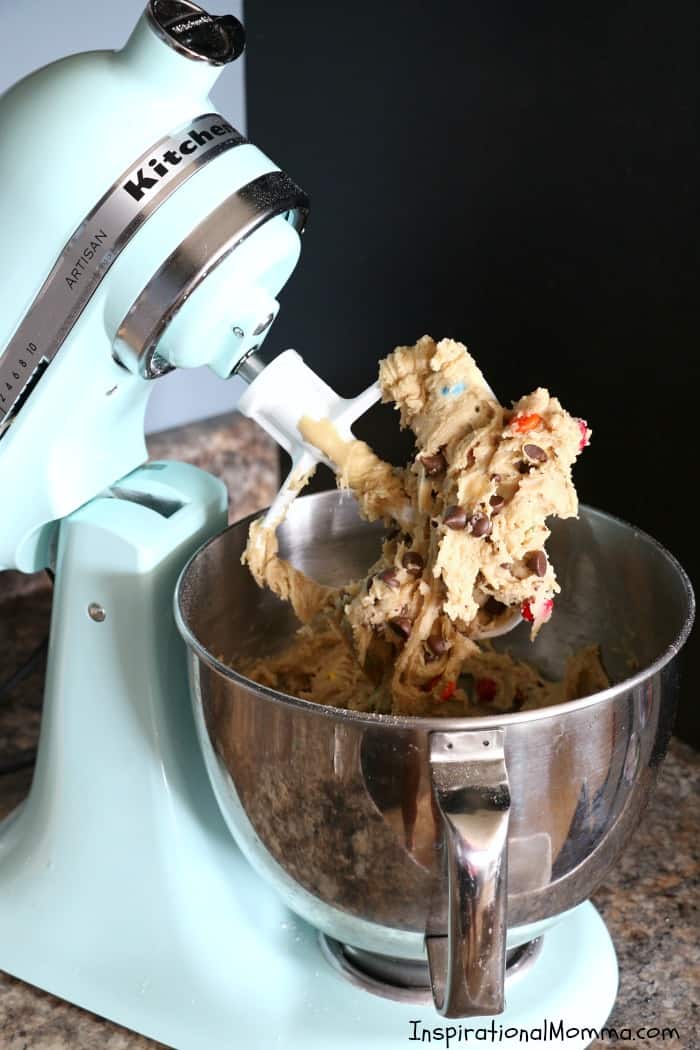 - Mix in 1 cup chocolate chips and all M&Ms.