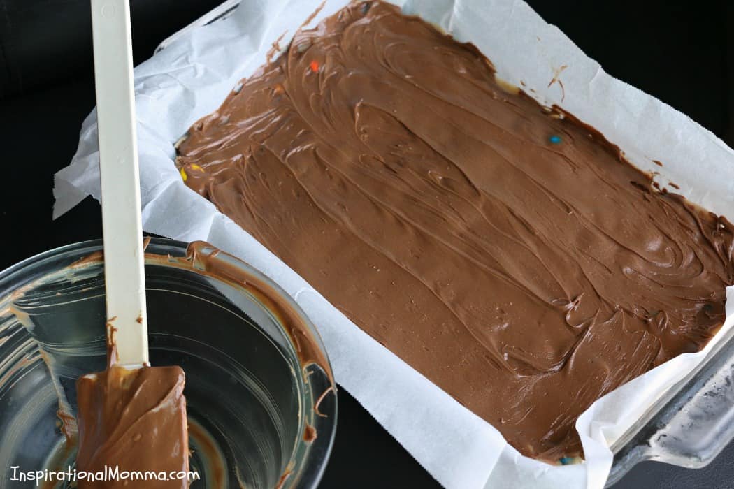 - Melt ½ cup chocolate chips and combine with peanut butter to make the topping.
