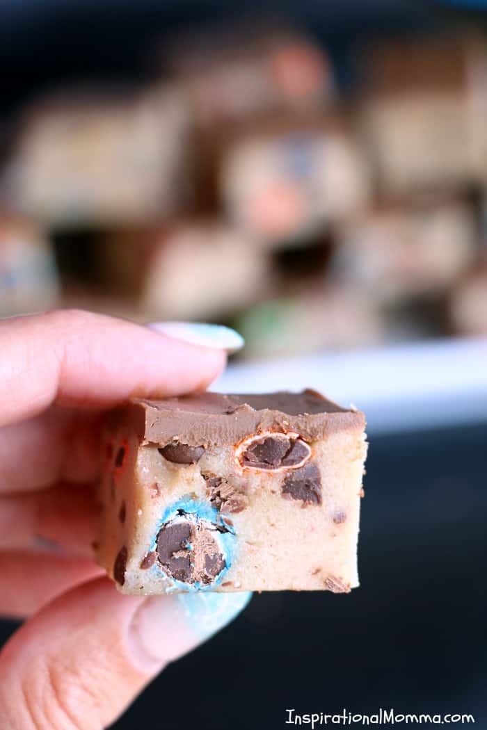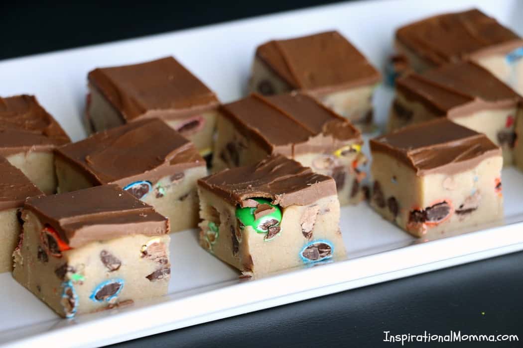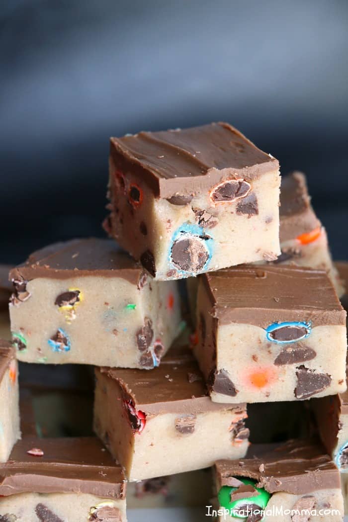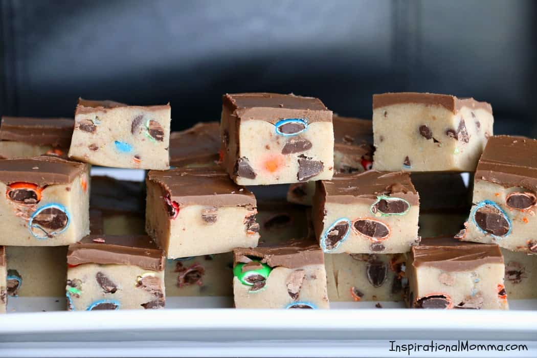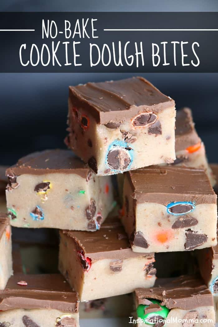 Because I know just how much my family likes the dough, I made it my mission to create a perfect treat that would satisfy our sweet tooth. And as a result, we quickly fell in love with No-Bake Cookie Dough Bites. Can it get any better than this? Creamy cookie dough and crunchy M&Ms all covered with a perfect layer of chocolate and peanut butter.