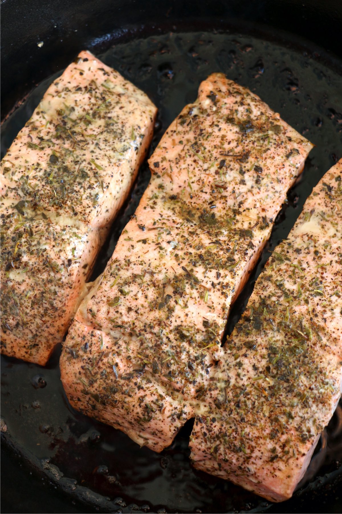 Step 5: Cover the skillet and cook on medium heat until the salmon is pink and flaky.