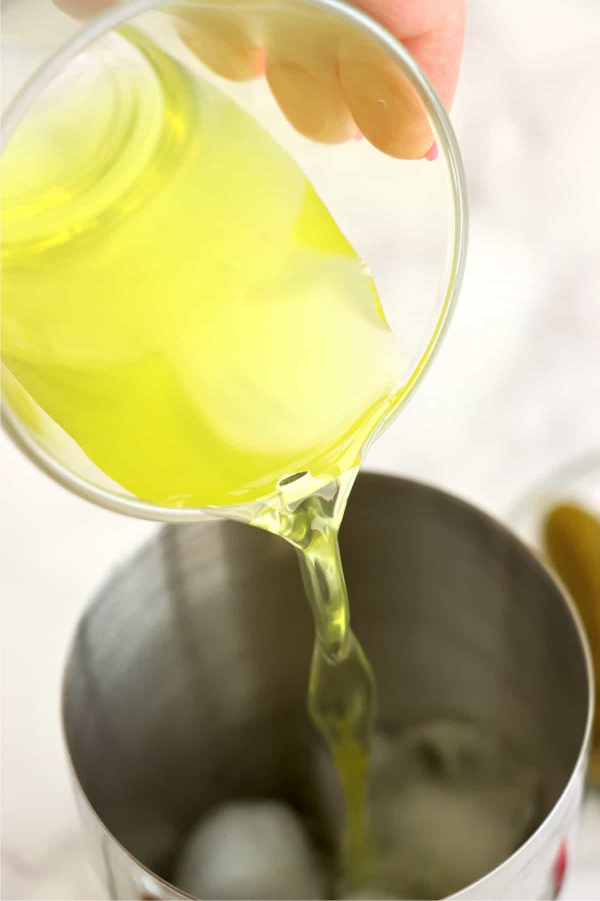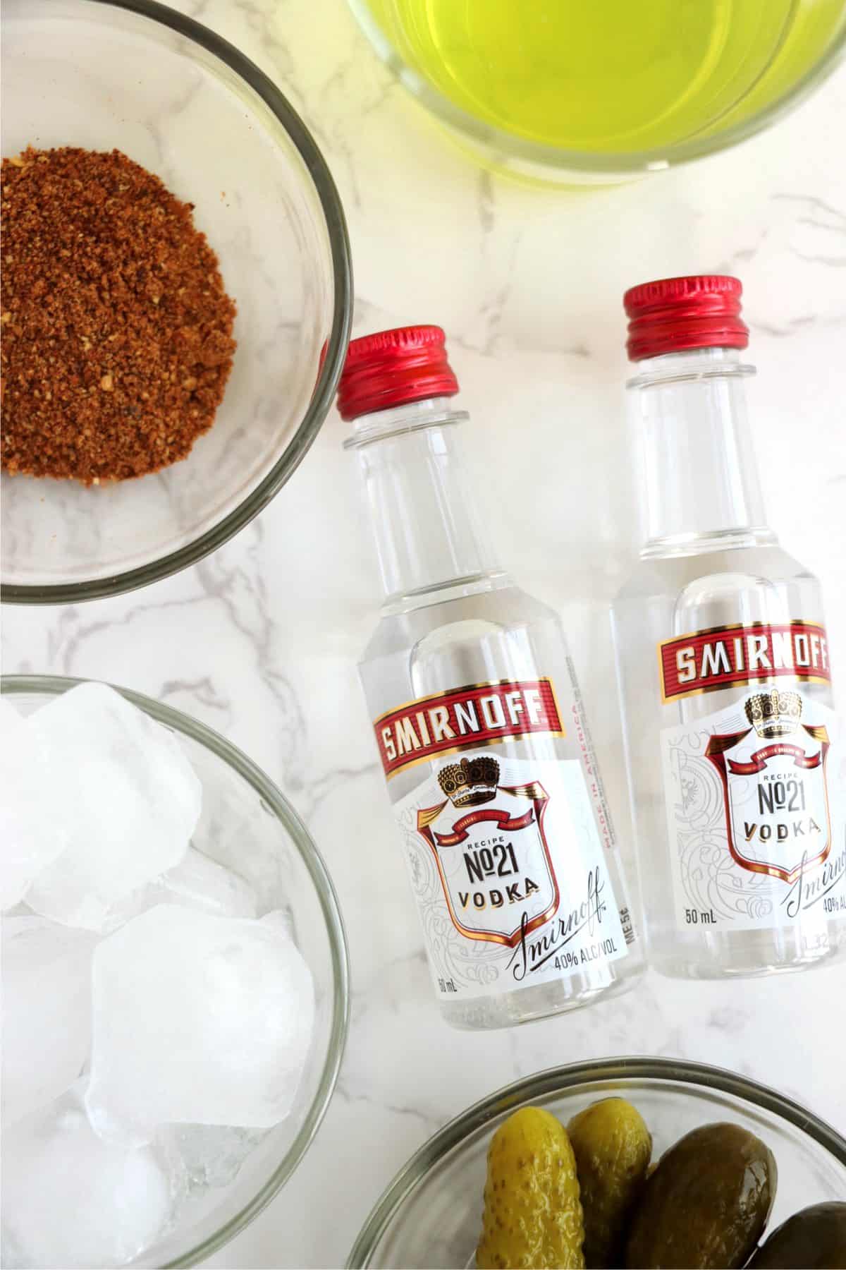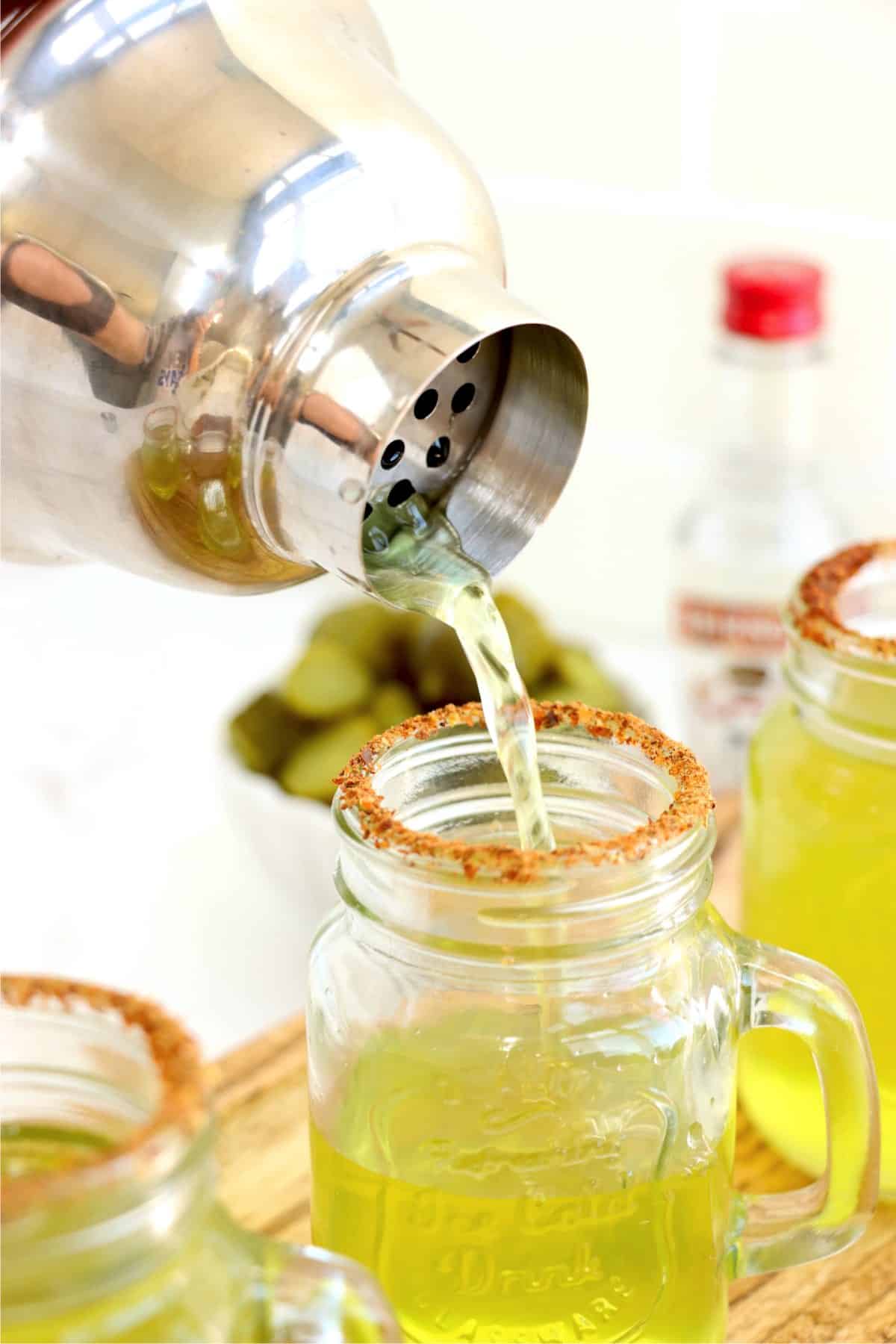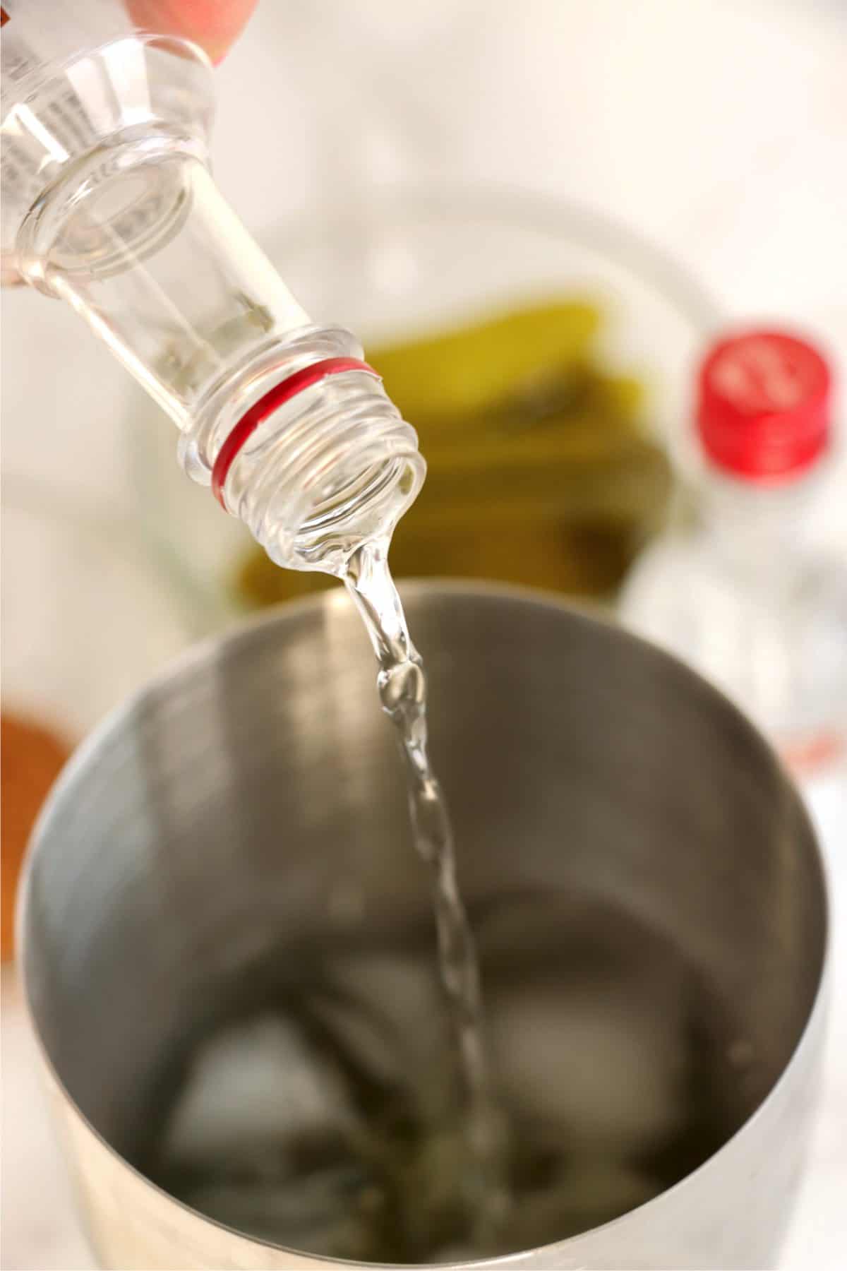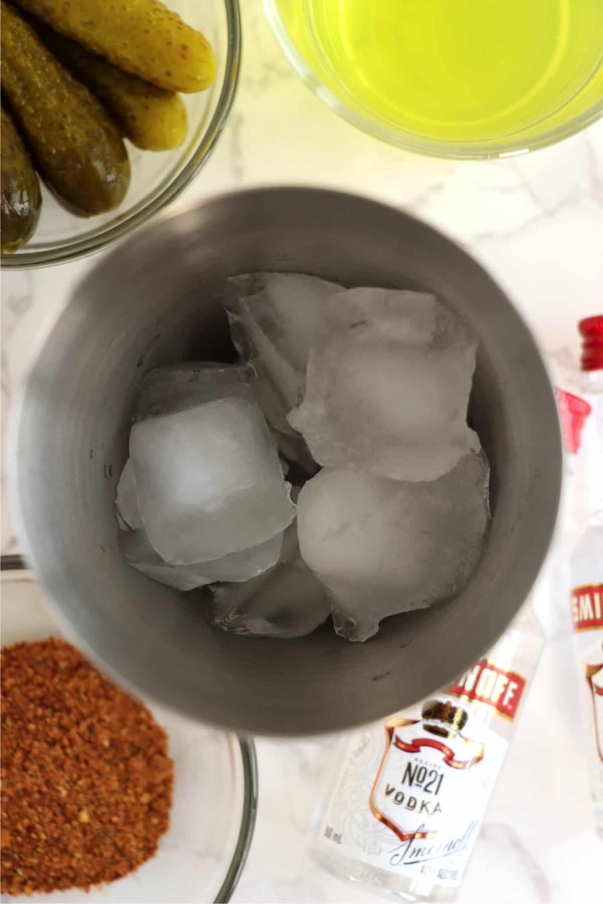- Place ice, pickle juice, and vodka in a cocktail shaker. Shake well.