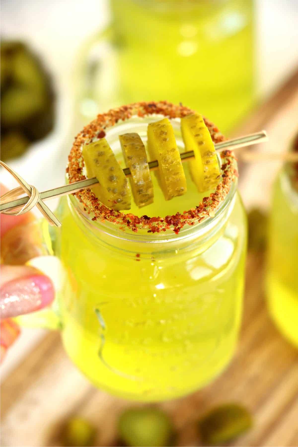 3: Pour the cocktail into the glass and garnish with dill pickle slices. Enjoy!