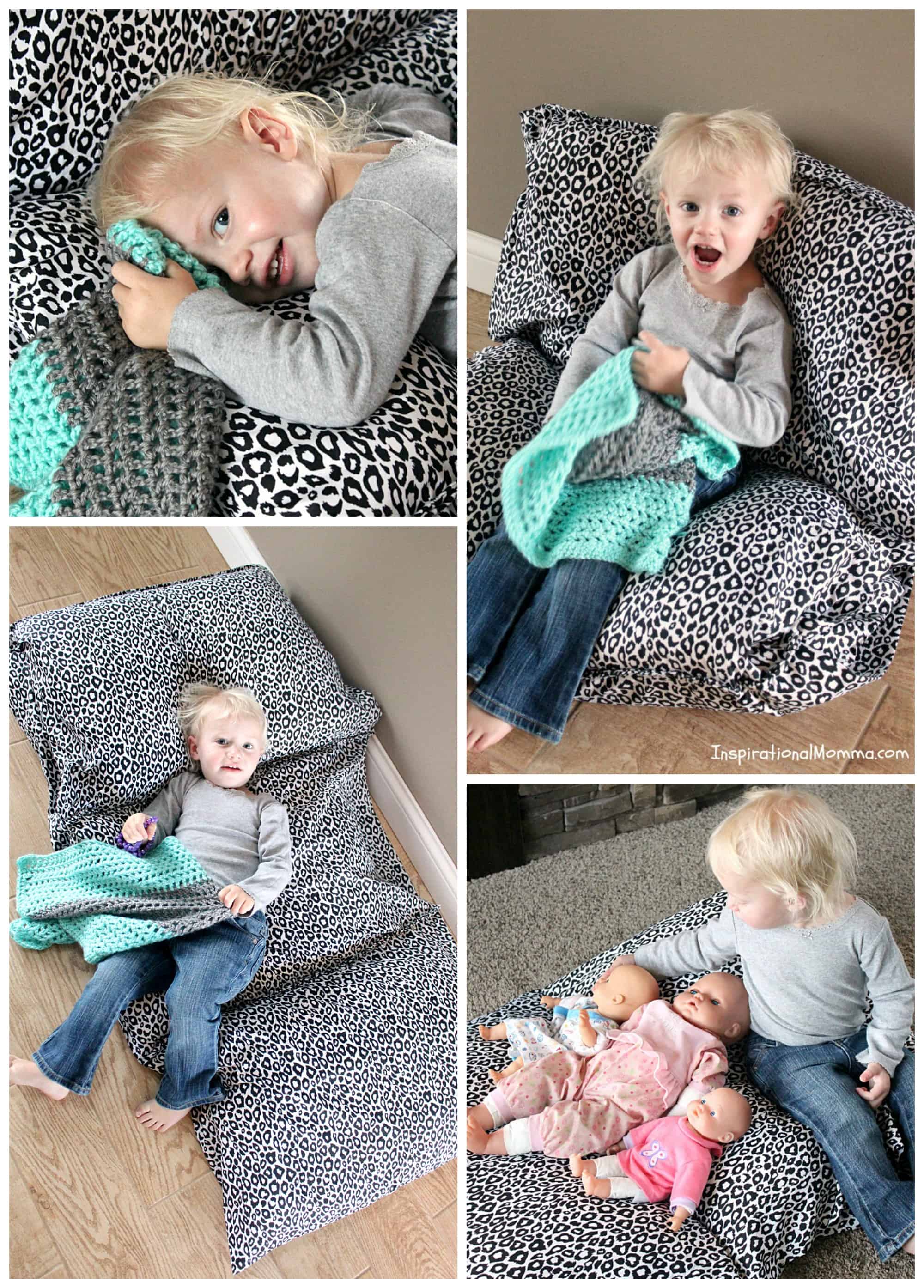 I decided to create a Pillowcase Bed/Chair for each of my children. This would provide them with a comfy space of their own for our movie nights. On a quick trip to Wal-Mart, I found pillowcases on clearance for $1.47 each and the pillows were just $2.37 each. I was able to make a Pillowcase Bed/Chair for just $16.20 each. I also had four Pillowcase Bed/Chairs made in 40 minutes. (Not to mention four amazed children.)