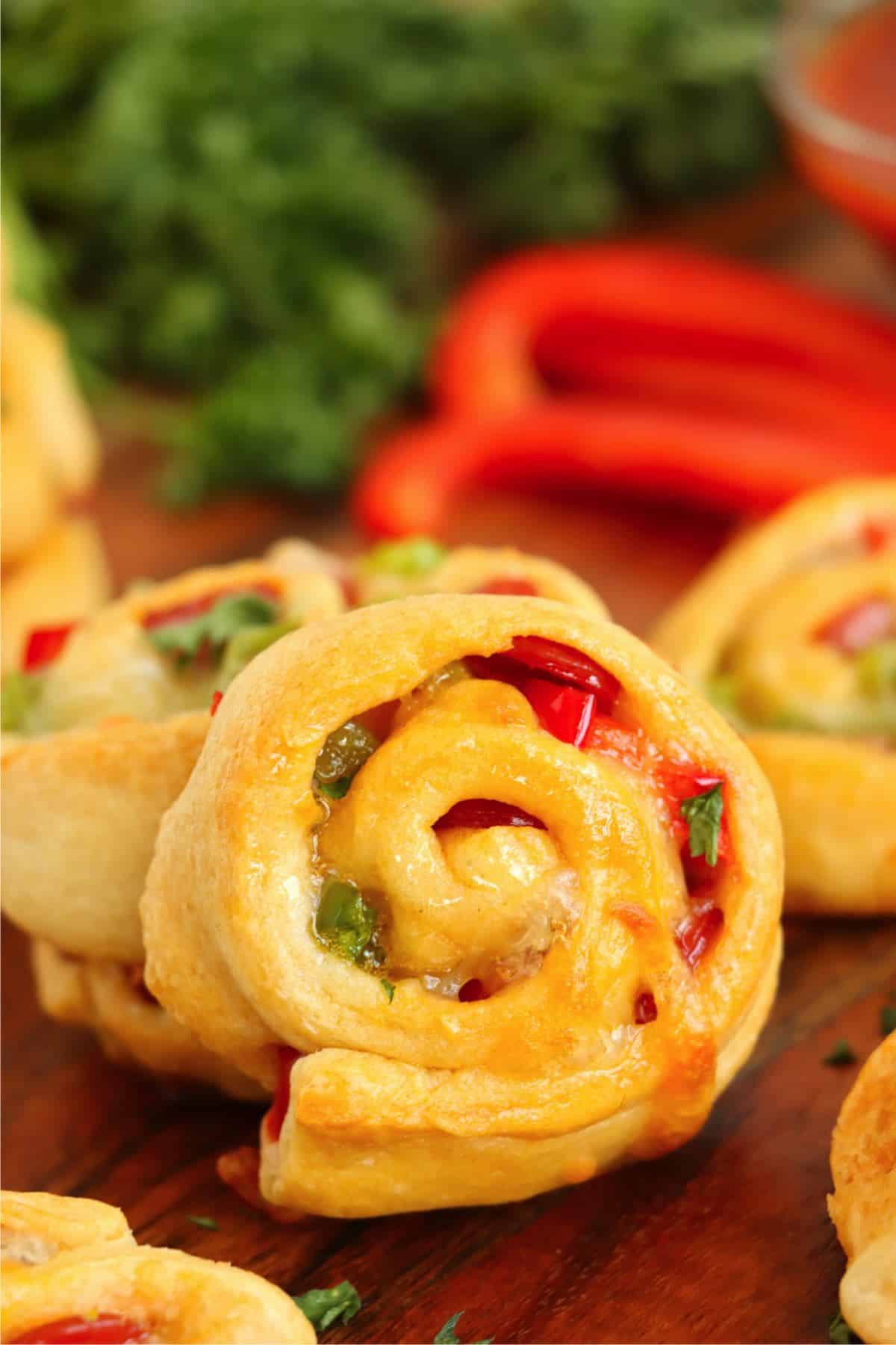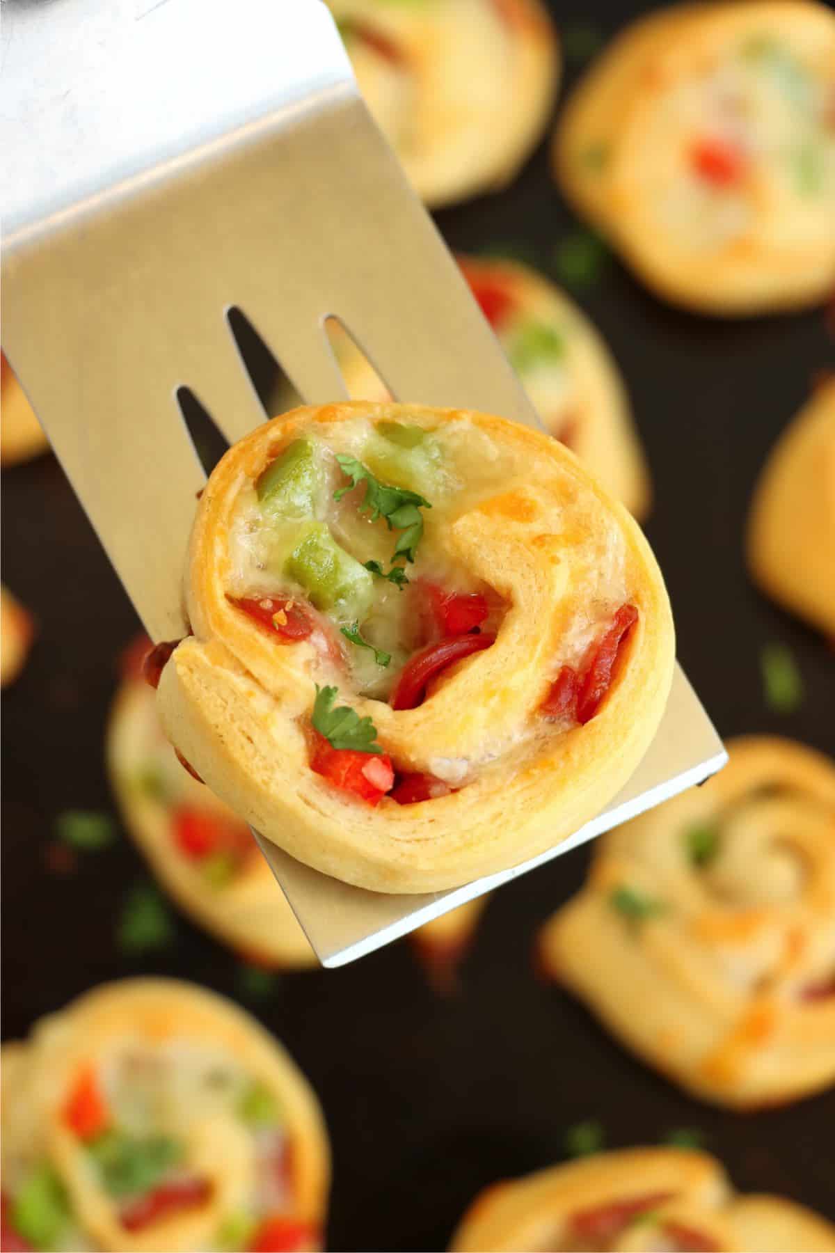 Reheat: Place the pinwheels on a parchment-lined baking sheet and bake at 375 until warmed through.