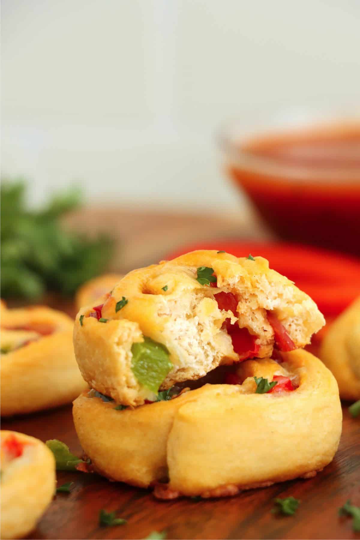 These pizza pinwheels are stuffed full of pepperoni, bell peppers, and mozzarella cheese, baked to golden perfection, then served with pizza sauce for dipping. They're an appetizer that's as delicious as it is fun.