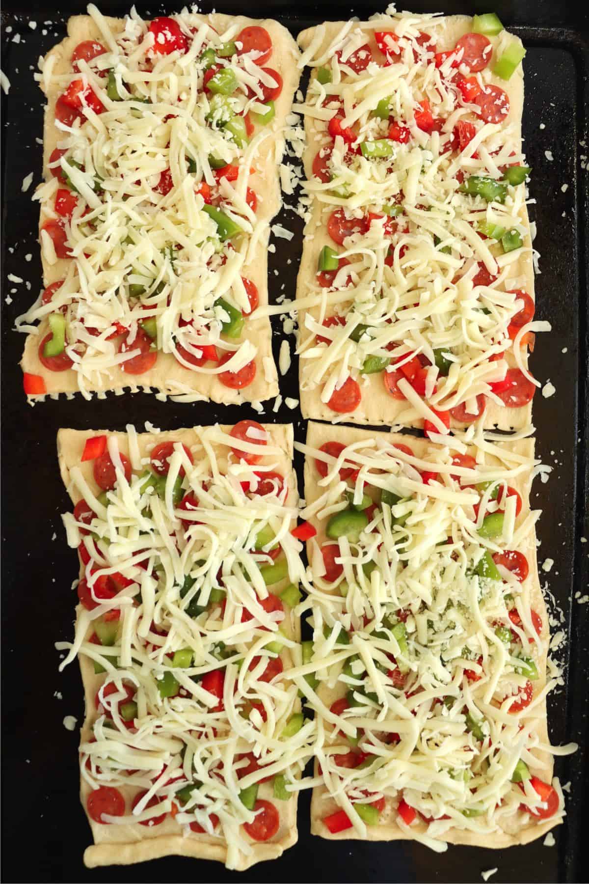 - Add pepperoni, peppers, and cheese evenly on all rectangles.