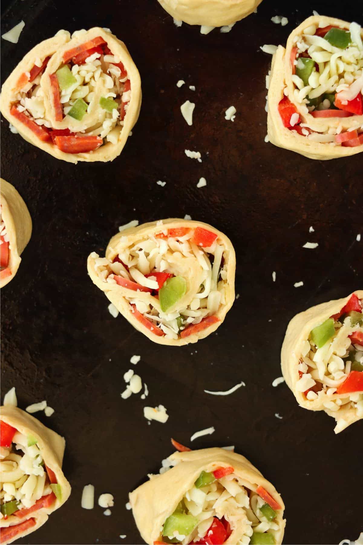 - You can use any of your favorite toppings like olives, bacon pieces, cooked sausage, and the like in these pizza pinwheels.