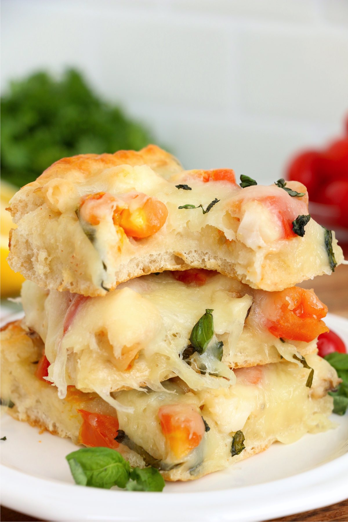 - Sprinkle basil strips evenly over the diced tomatoes.